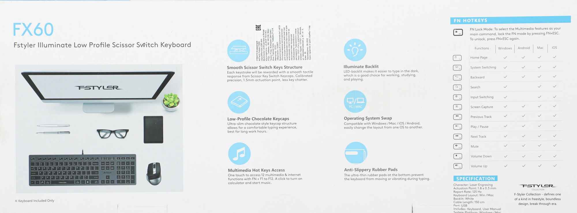| Особенности | Ножничный механизм нажатия. Горячие мультимедийные клавиши: 12 Fn |