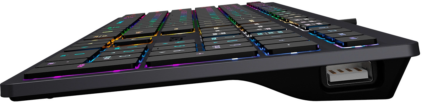 | Особенности | Ножничный механизм нажатия. Горячие мультимедийные клавиши: 12 Fn. Клавиатура имеет два встроенных USB-порта, что идеально подходит для быстрого подключения или зарядки других USB-устройств. |