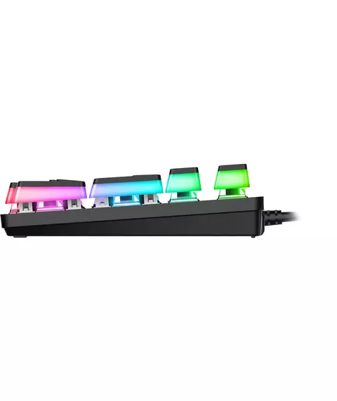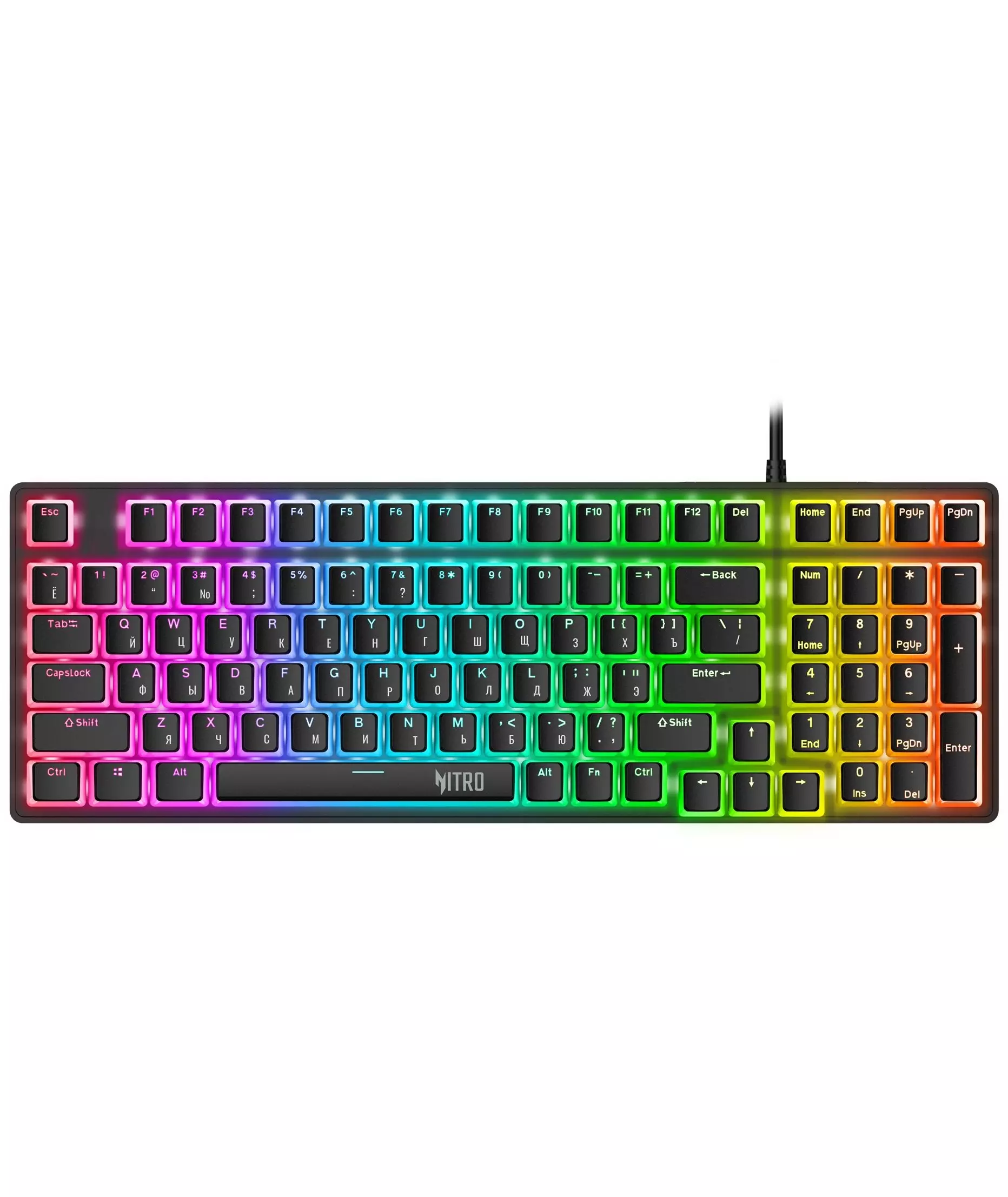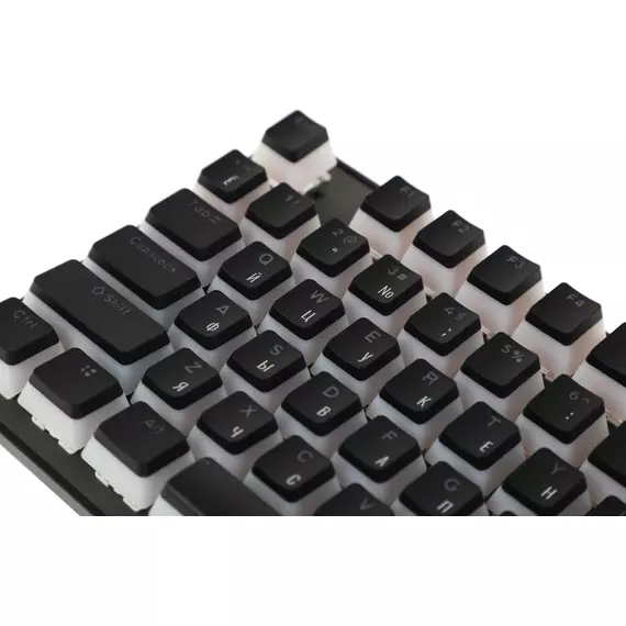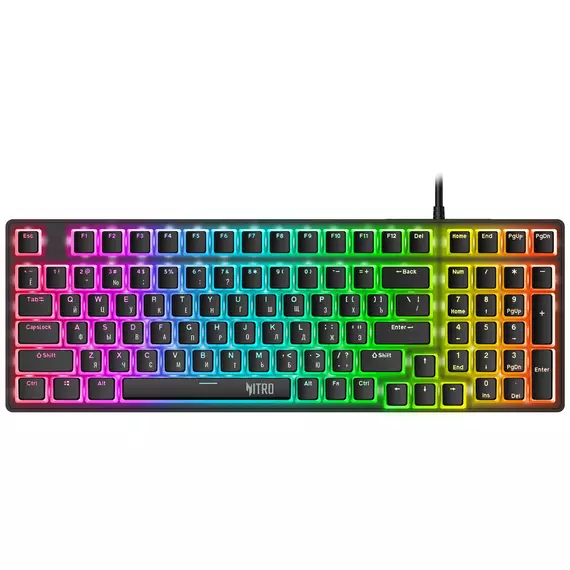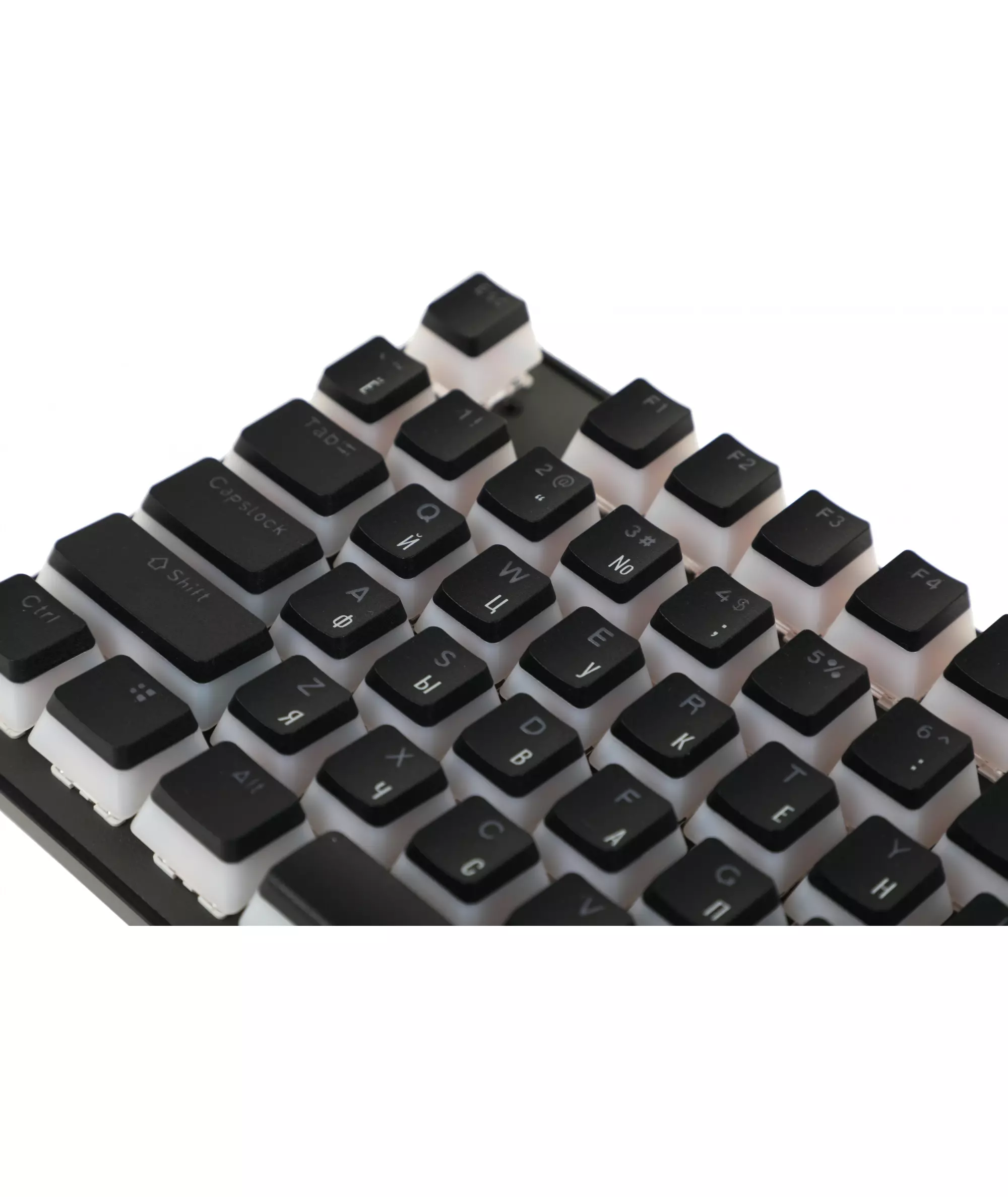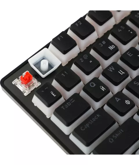 | Особенности | Механическая клавиатура с негромкими красными свичами.Широкие откидные ножки. Резиновые накладки. Клавиатура типа скелетон с матовыми подсвечивающимися кейкапами (RGB подсветка). Регулируемая подсветка. Компактное расположение клавиш. Металлическая верхняя панель |