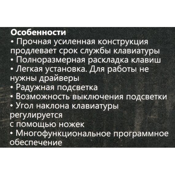 | Особенности | Прочная усиленная конструкция продлевает срок службы клавиатуры. Радужная подсветка. Возможность выключения подсветки. Угол наклона клавиатуры регулируется с помощью ножек. Многофункциональное программное обеспечение. |