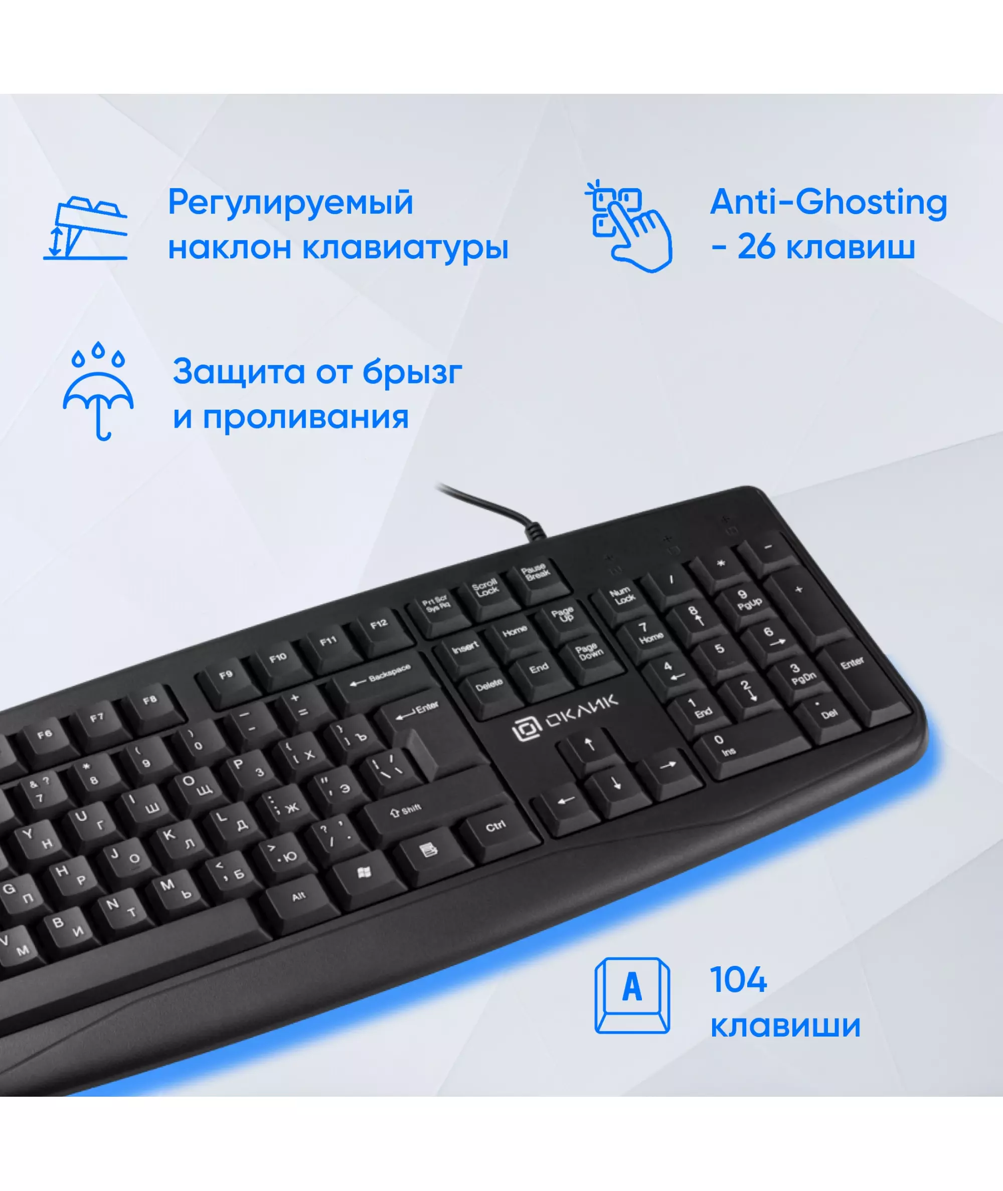 | Особенности | Ресурс нажатий:10 000 000. Anti-ghosting до 26 одновременных нажатий. Влагозащитный корпус. Антифрикционные прорезиненные ножки. Автоматическая конфигурация без специальных драйверов. |