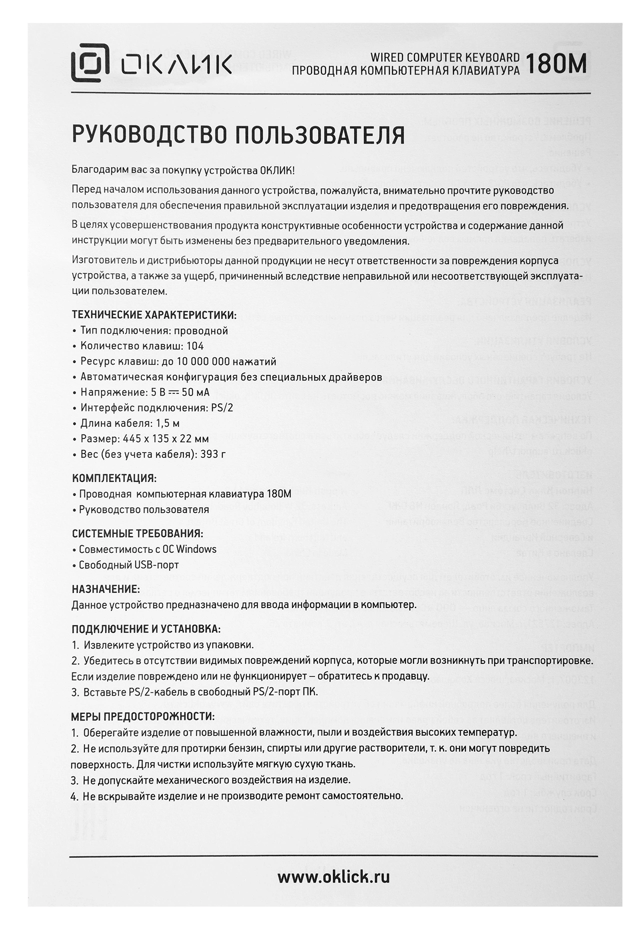Клавиатура Oklick 180M черный PS/2 [313180]