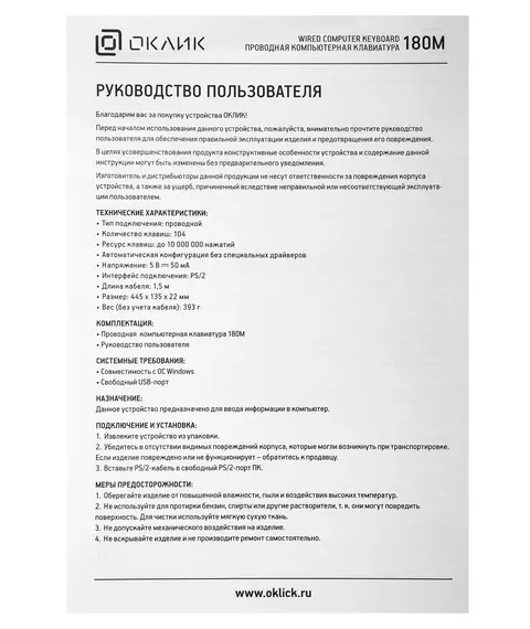 | Особенности | Универсальная офисная клавиатура с разъемом PS/2 |
