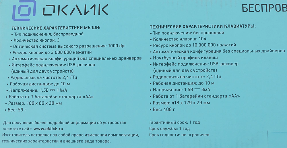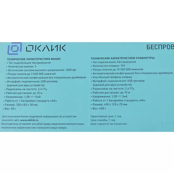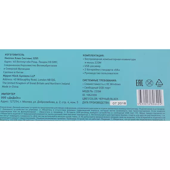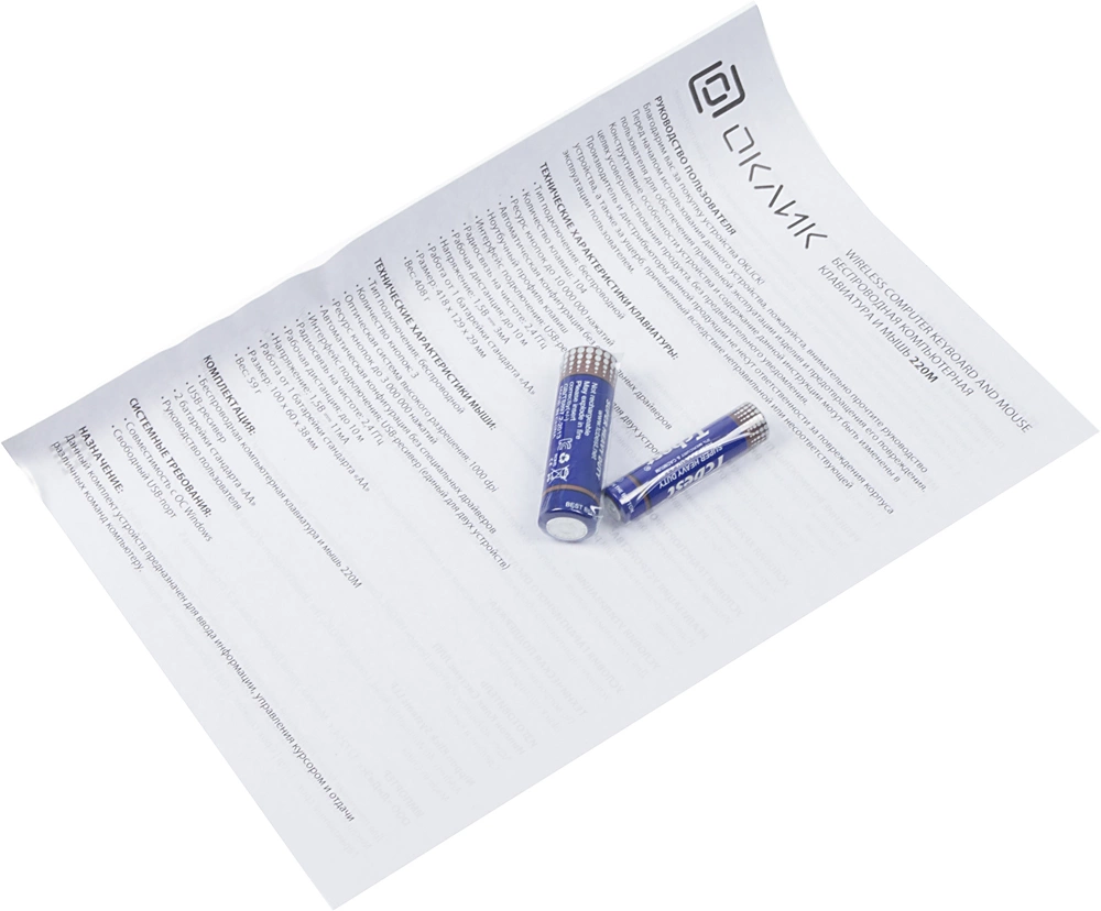 | Комплект поставки | Беспроводная компьютерная клавиатура и мышь 220М, USB-ресивер.2 батарейки стандарта АА. Руководство пользователя. |