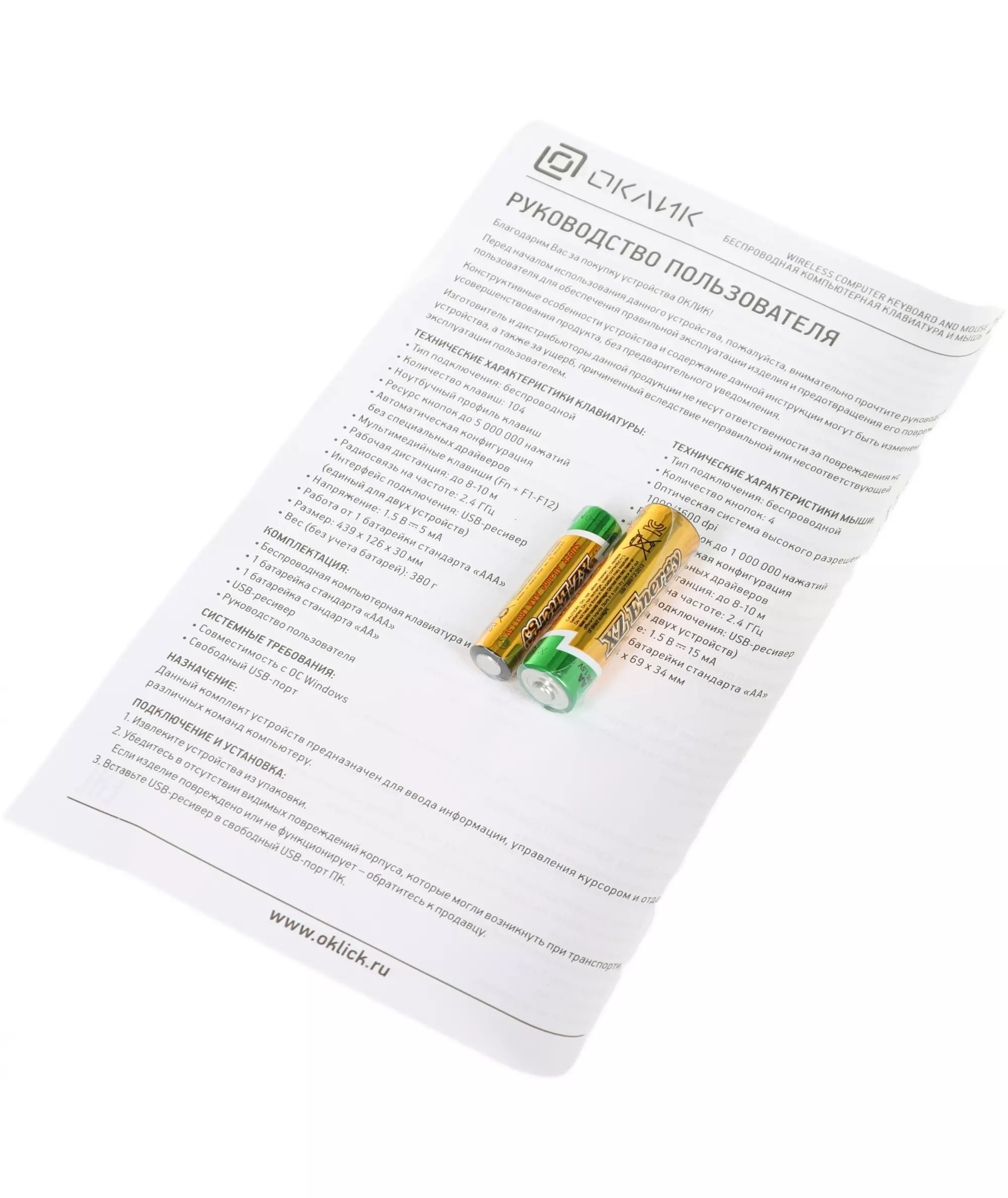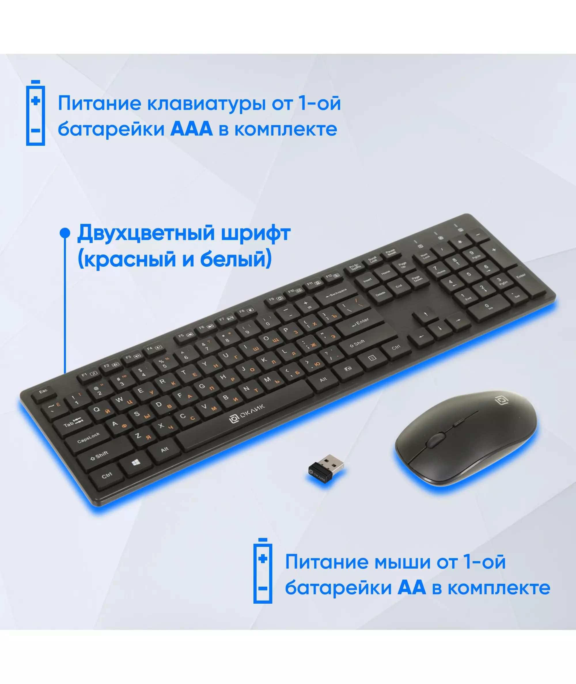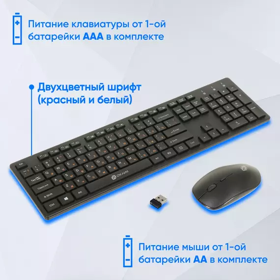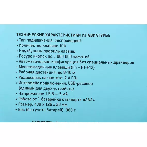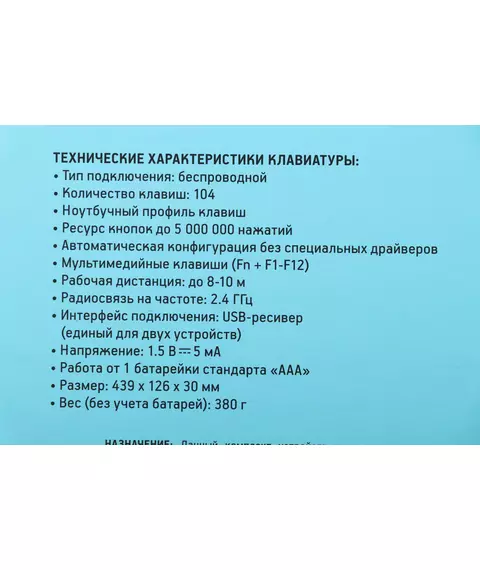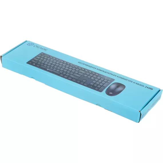 | Комплект поставки | Беспроводная компьютерная клавиатура и мышь 240M, 2 батарейки стандарта «AAA», 1 батарейка стандарта «AA», USB-ресивер |