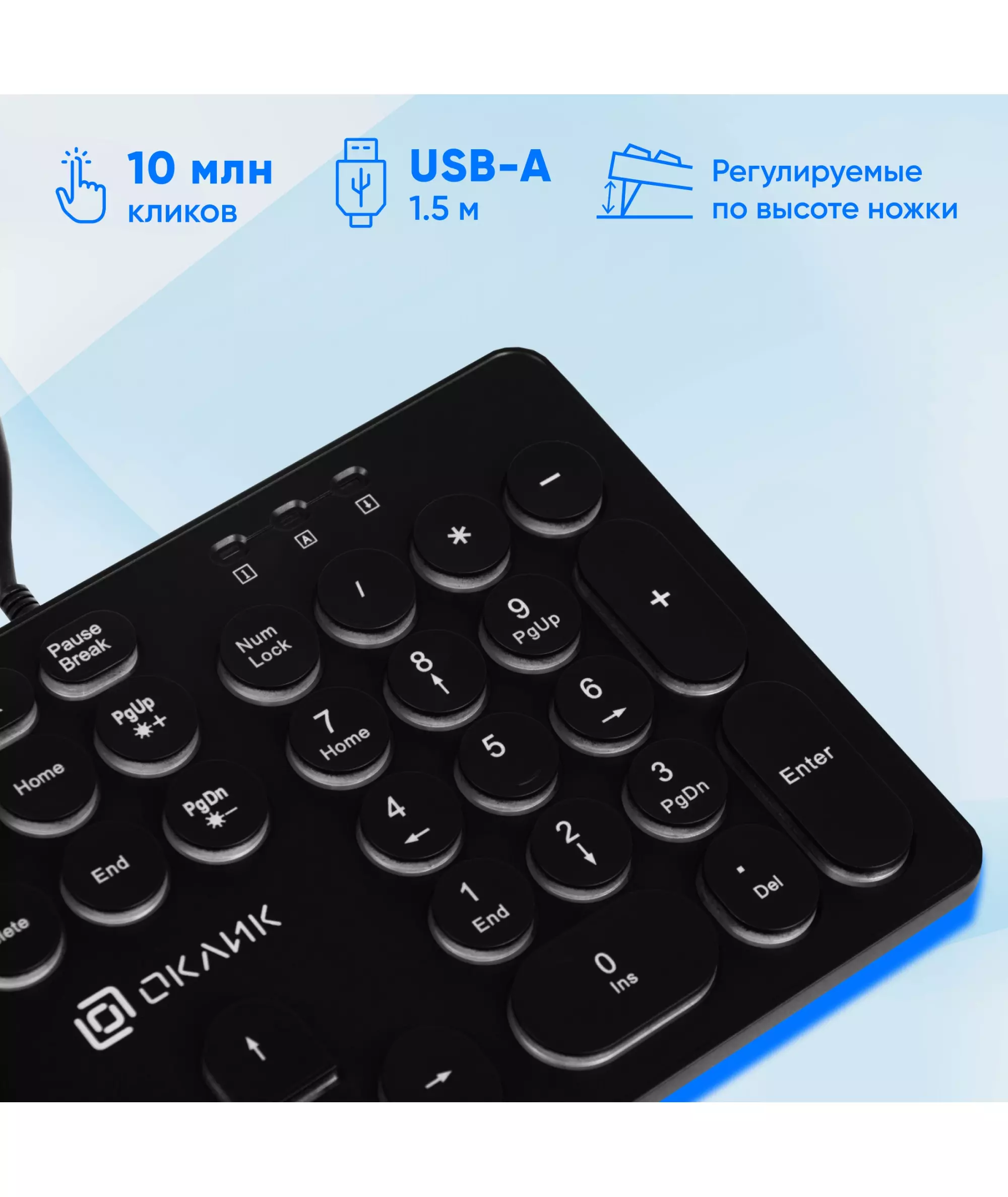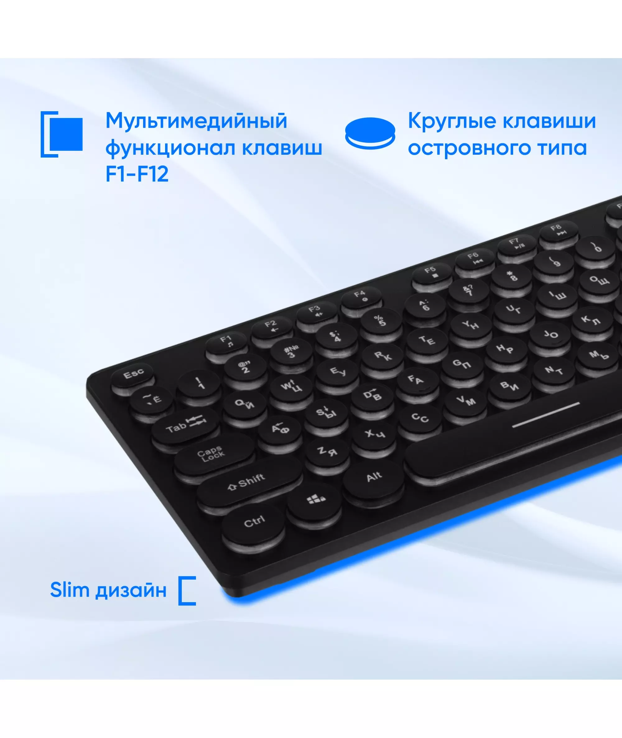 | Особенности | Тонкая клавиатура с круглыми клавишами островного типа, с мультимедийный функционалом, регулируемая подсветка, блокировка клавиши Пуск |