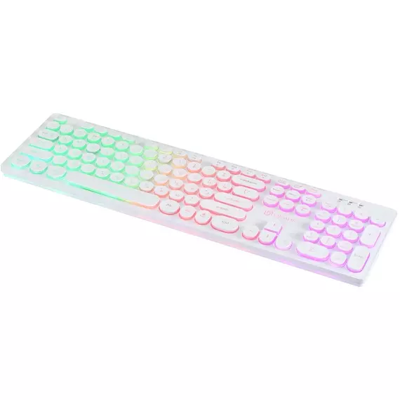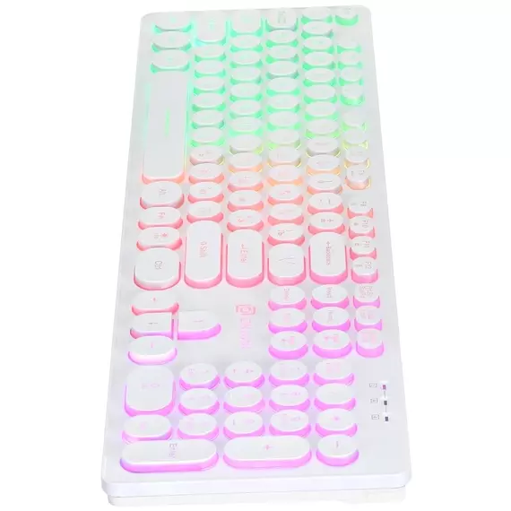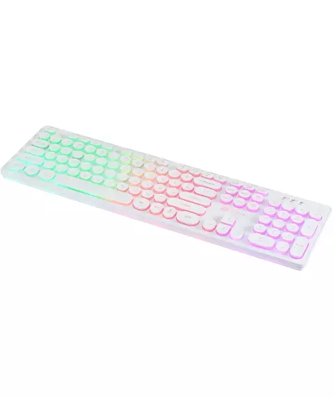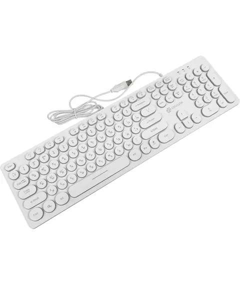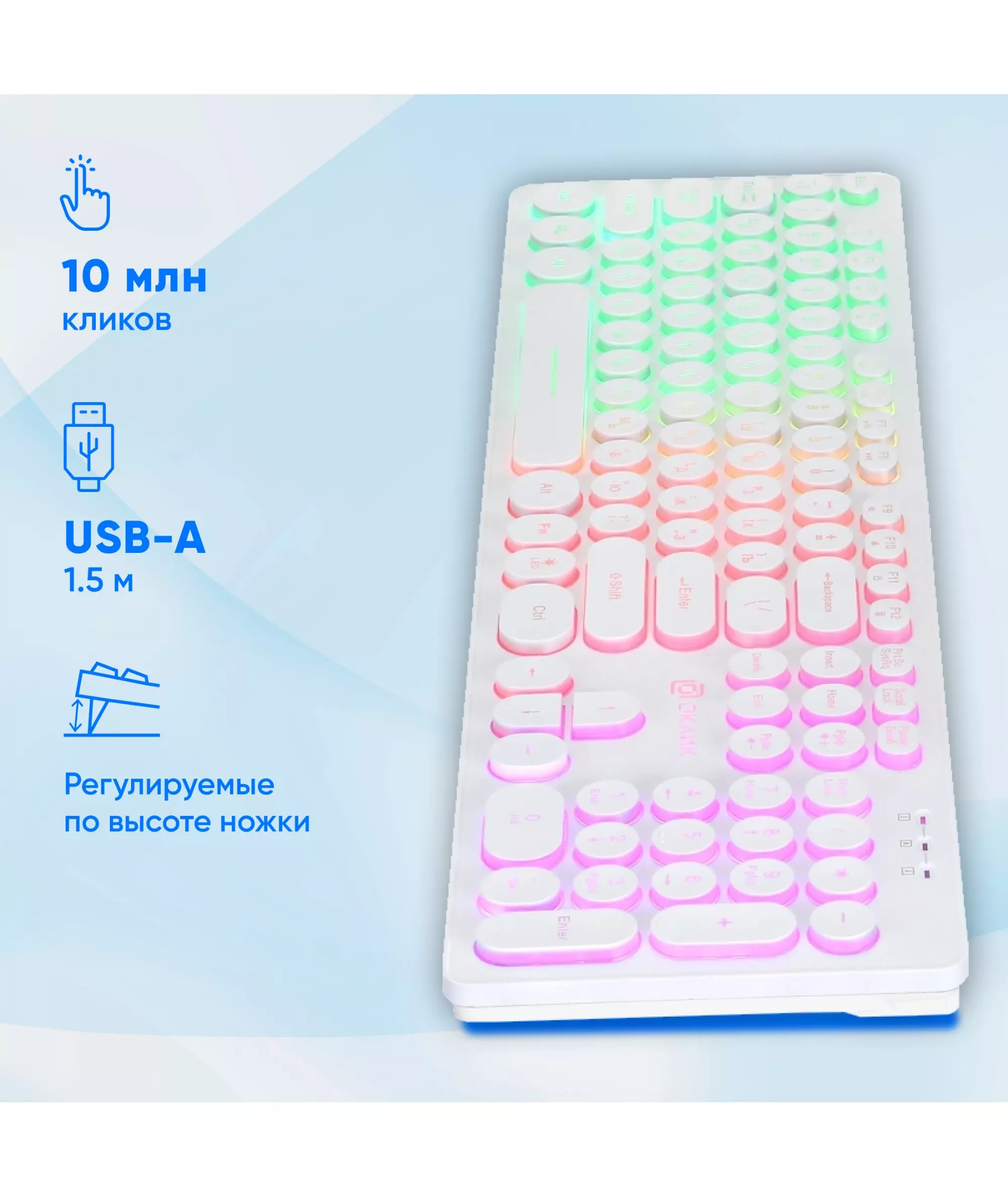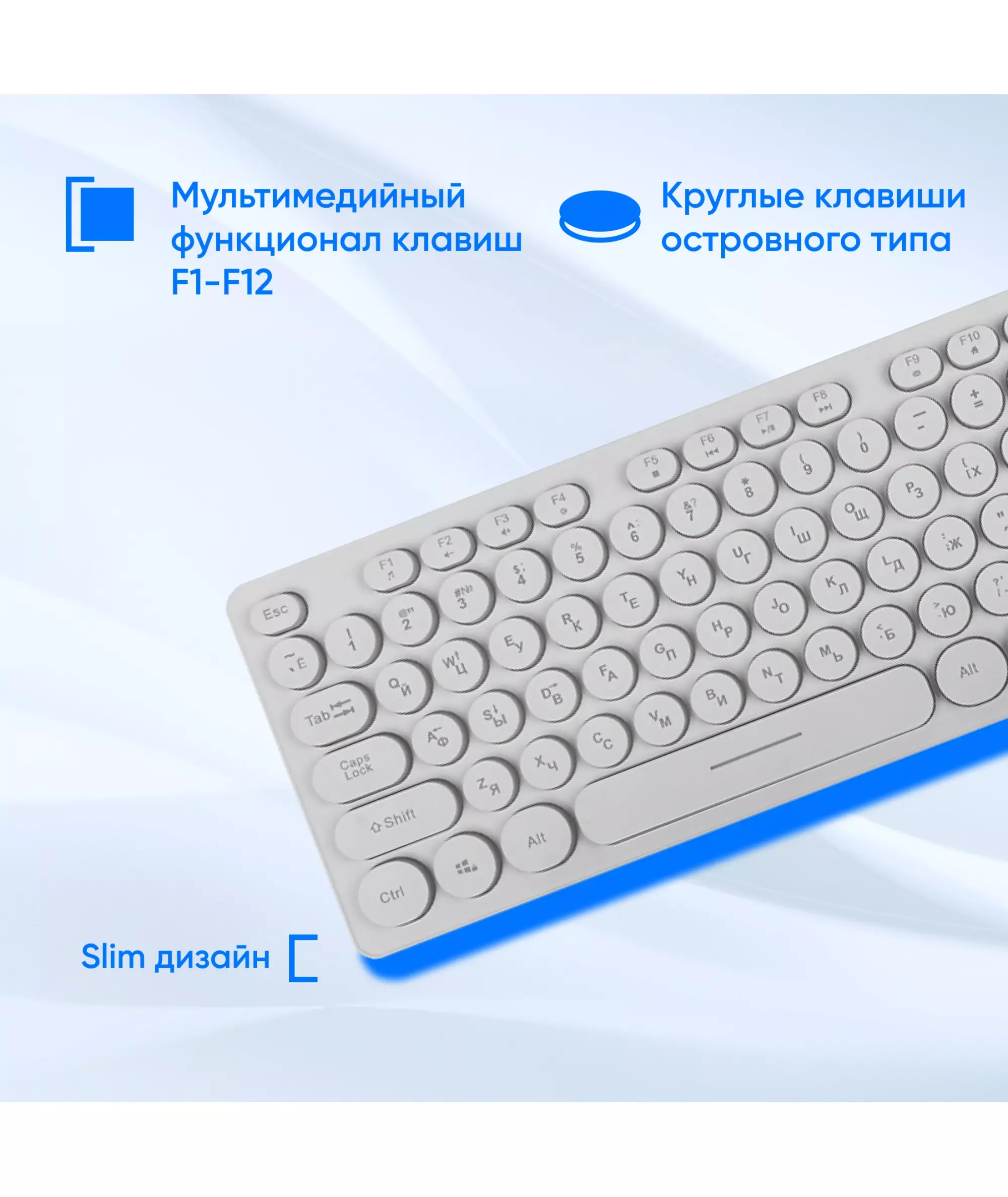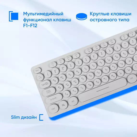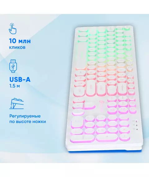 | Особенности | Тонкая клавиатура белого цвета с круглыми клавишами островного типа с, мультимедийный функционалом, регулируемая подсветка, блокировка клавиши Пуск |