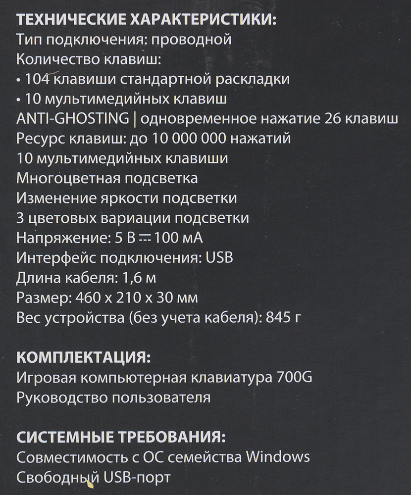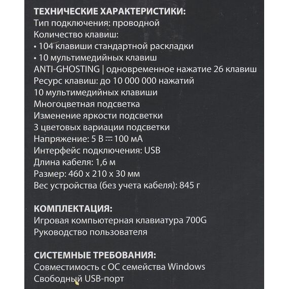| Особенности | Anti-Ghosting: одновременное нажатие до 26 клавиш, многоцветная подсветка, 3 цвета подсветки, ресурс клавиш до 10 000 000 нажатий |