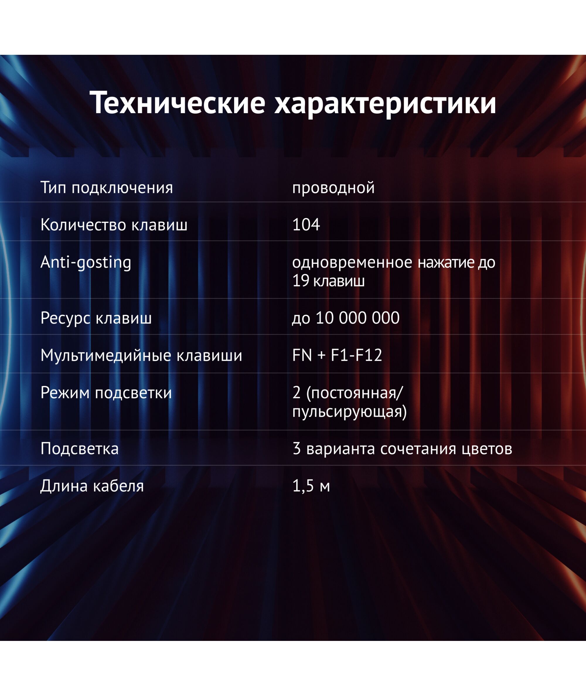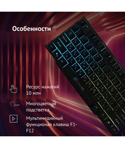 - Особенности: Игровая клавиатура с регулируемой подсветкой, мультимедийный функционал клавиш, ресурс кнопок до 10000000 нажатий, Anti-Hosting - 19 клавиш, блокировка клавиши Пуск