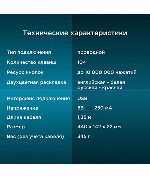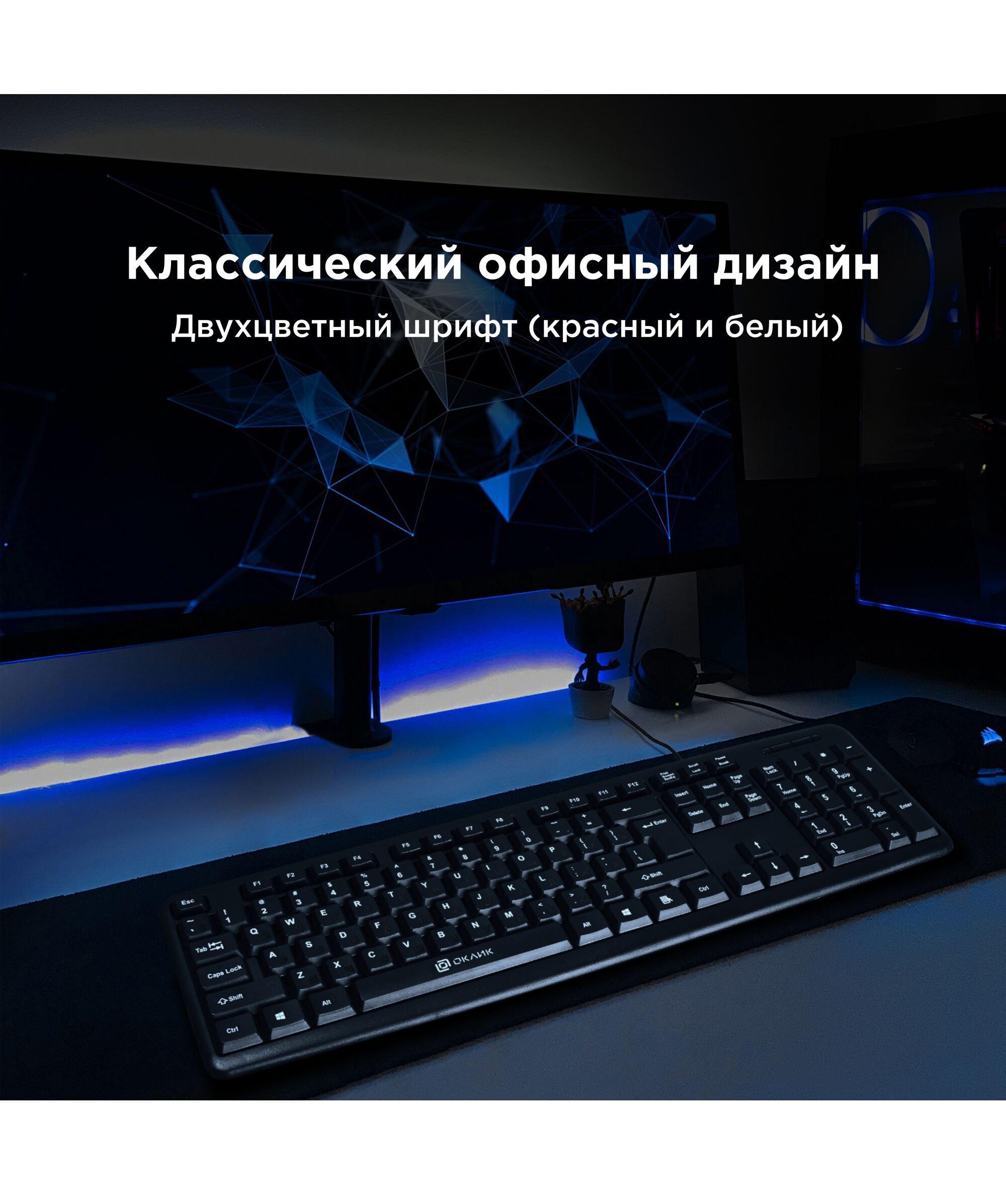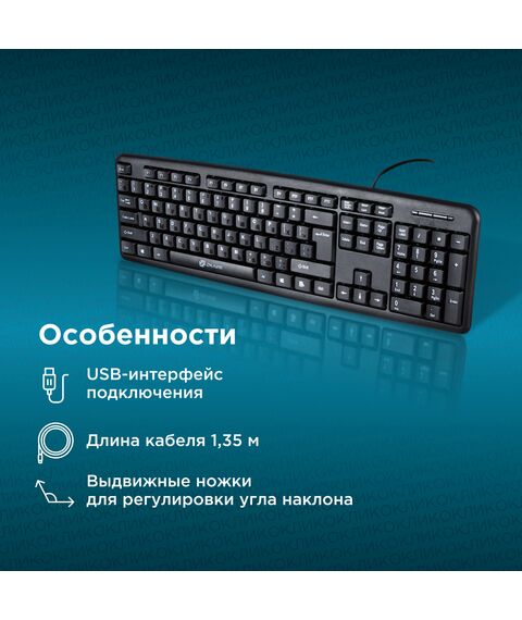 | Особенности | Универсальная офисная клавиатура, двухцветный шрифт, регулируемая высота |