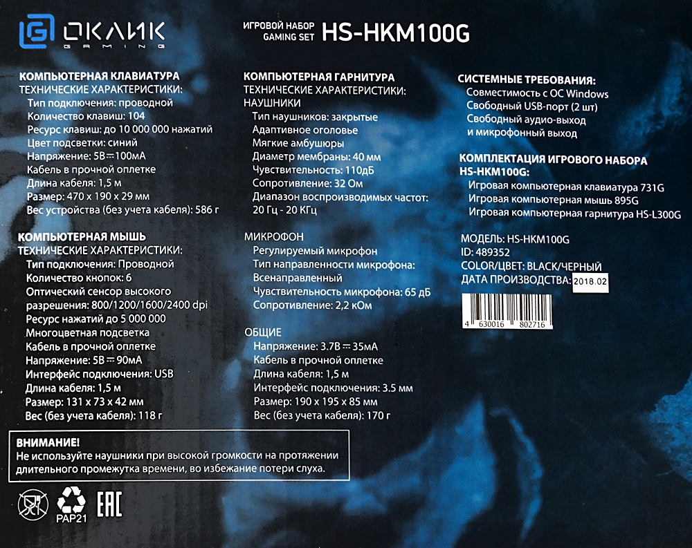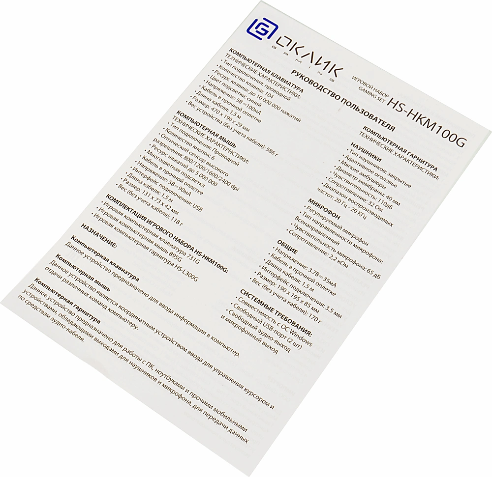 | Комплект поставки | Игровая компьютерная клавиатура 731GИгровая компьютерная мышь 895GИгровая компьютерная гарнитура HS-L300GРуководство пользователя |