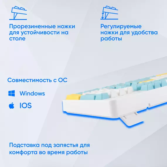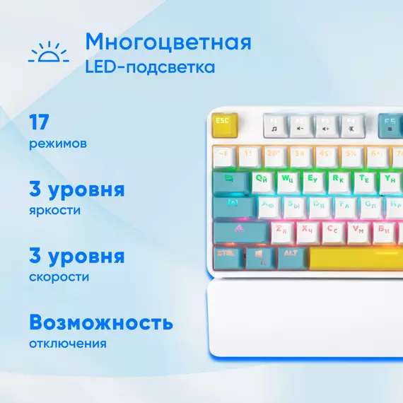 | Особенности | Универсальная механическая клавиатура классического дизайна с подставкой под запястья. Благодаря надежным тактильным свитчам коричневого цвета и яркому дизайну, клавиатура Оклик K915X станет вашим надежным и любимым инструментом на рабочем столе. + Anti ghosting 26 клавиш, ресурс нажатий 20 млн |