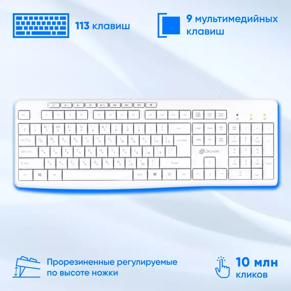 | Особенности клавиатуры | Эргономичная клавиатура с продуманной конструкцией для работы дома и в офисе. Девайс оборудован регулируемыми по высоте ножками. Дополнительные мультимедийные и офисные клавиши обеспячат быстрый доступ и управление нужными приложениями. |