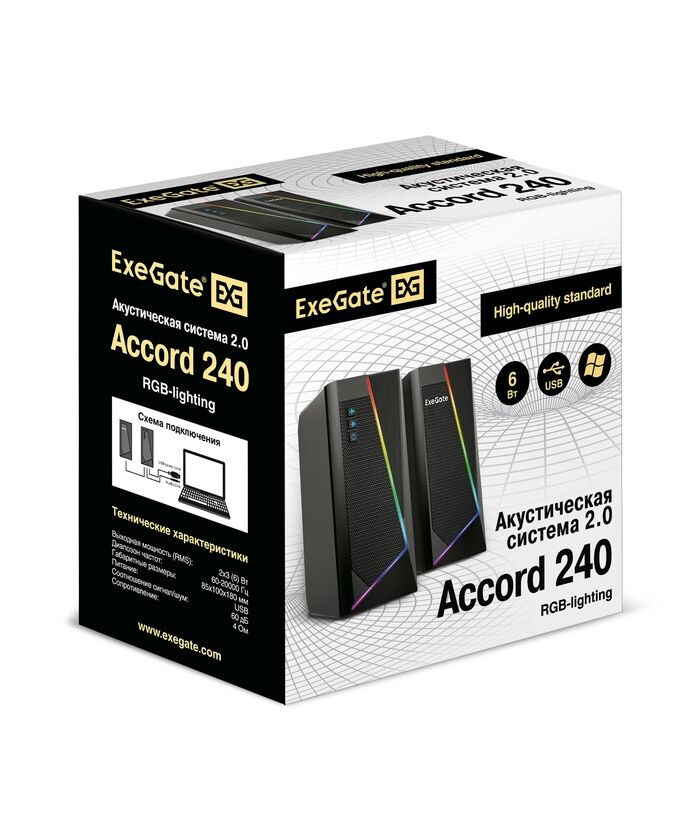Акустическая система Exegate Accord 240 2х3Вт (6Вт RMS), питание USB, 60-20000Гц, черный, RGB подсветка, Color Box [EX289688RUS]