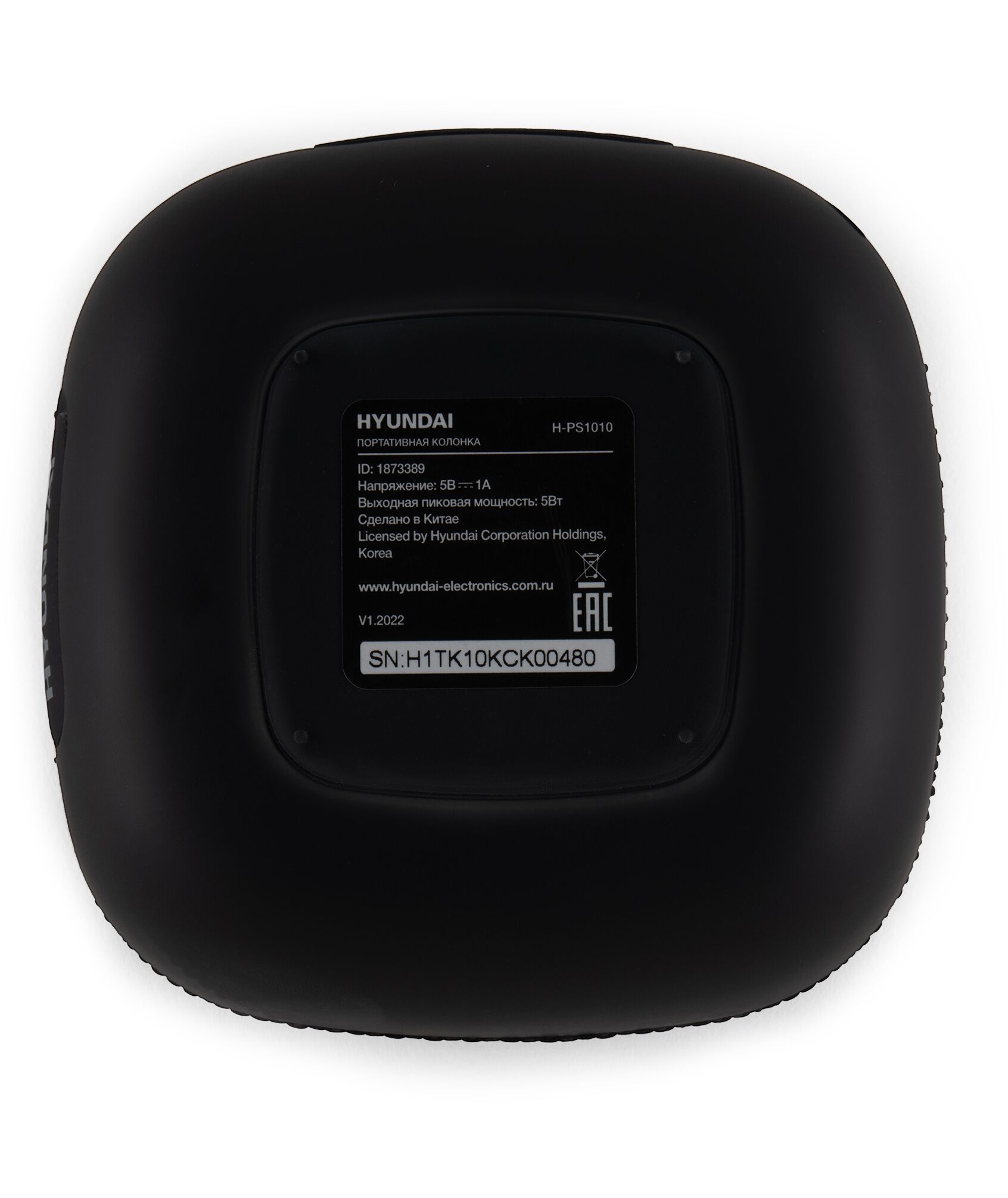 Кнопки, управляющие воспроизведением и его опциями, находятся на верхней панели прибора – их всего три, поэтому всё весьма интуитивно. Дизайн Hyundai H-PS1010 выполнен в минималистичном чёрном оформлении. Верхняя сетка защищает широкополосный динамик от физических повреждений.