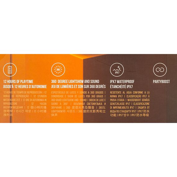 Зажгите вечеринку с фирменным звуком JBL и ослепительным круговым светодиодным шоу. Прочный водонепроницаемый корпус с защитой от воды по стандарту IPX7 и яркий свет, сопровождающий музыку до 12 часов от одной подзарядки.