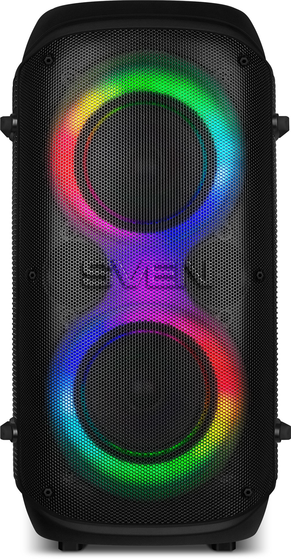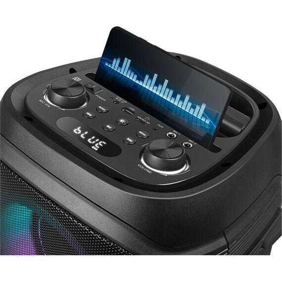 Беспроводное подключение двух колонок к одному источнику звука (TWS). Два микрофонных входа для караоке. Регулировка уровня эха караоке микрофона. Воспроизведение музыки с USB flash и microSD карт памяти. LED-дисплей. Пульт ДУ. Функция эквалайзера.