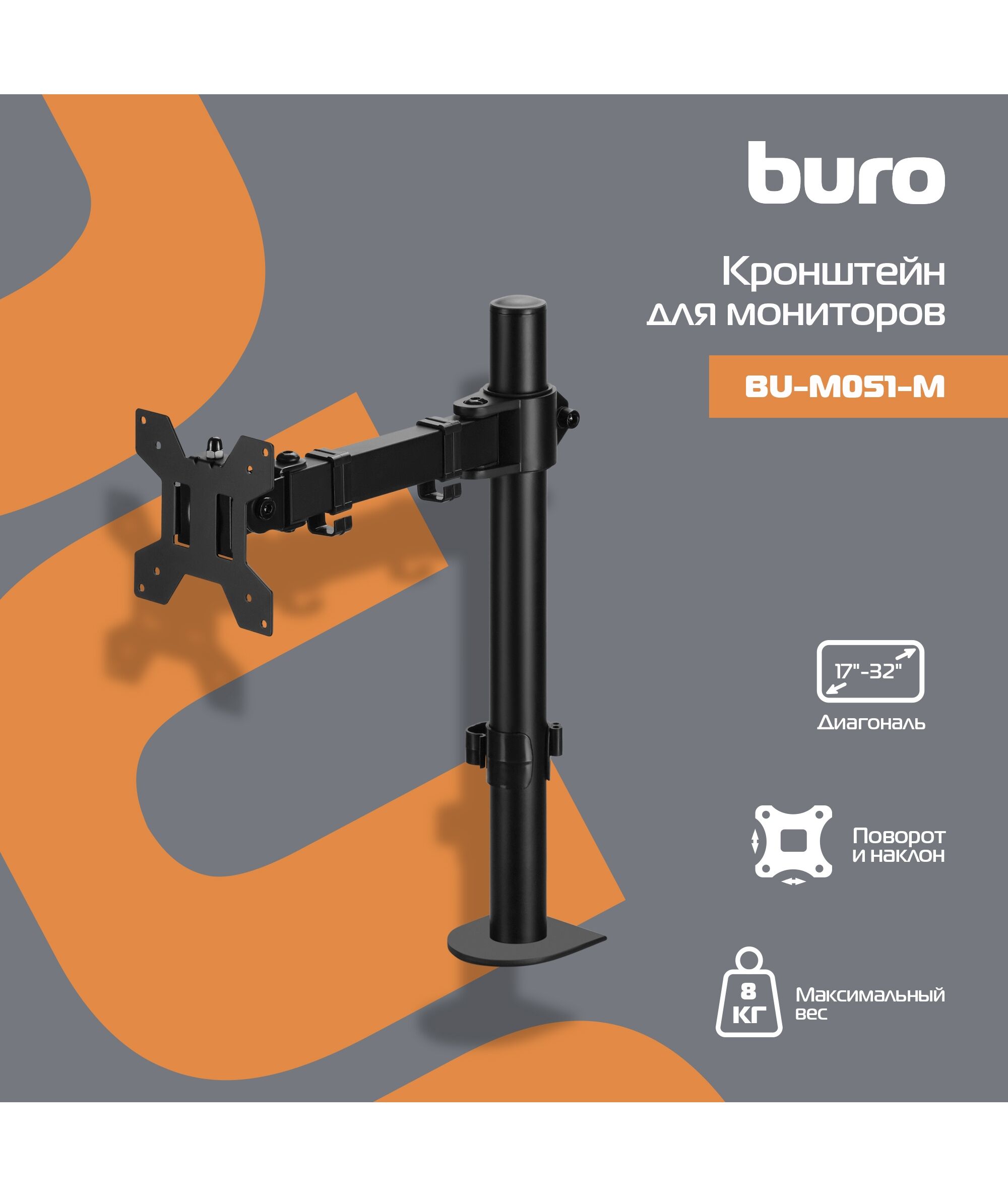 Кронштейн для мониторов ЖК BURO BU-M051-M черный 17"-32" макс.8кг крепление к столешнице поворот и наклон