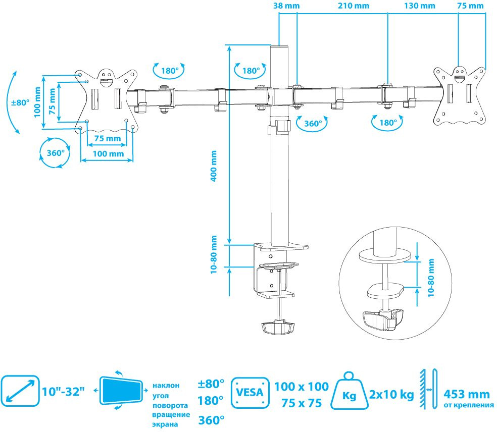 | Подходит для мониторов c диагональю | 15", 19", 22", 26", 32" |