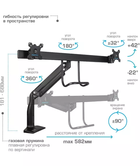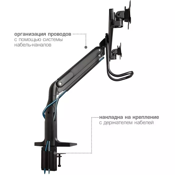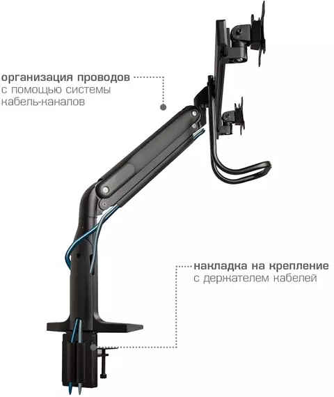 | Особенности | Надежная стальная конструкция, Многофункциональный – мониторы на кронштейне можно поворачивать вокруг совей оси на 360°, наклонять вверх и вниз, придвигать или удалять от себя, Регулируемое положение по высоте, максимальная высота 688 мм, Кабель-каналы для укладки соединительных кабелей |
