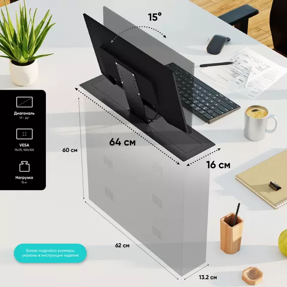 | Подходит для мониторов c диагональю | 15", 19", 22" |