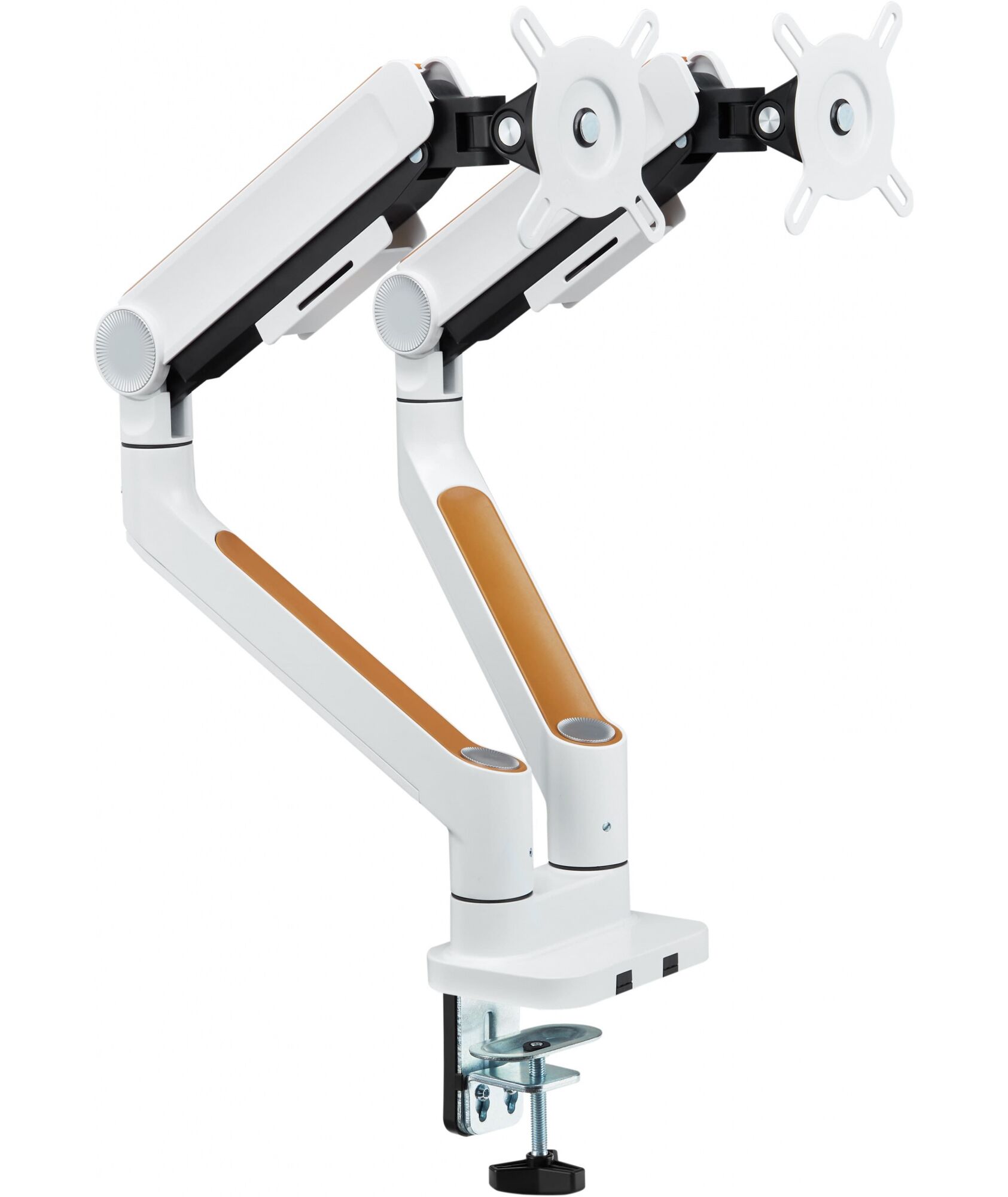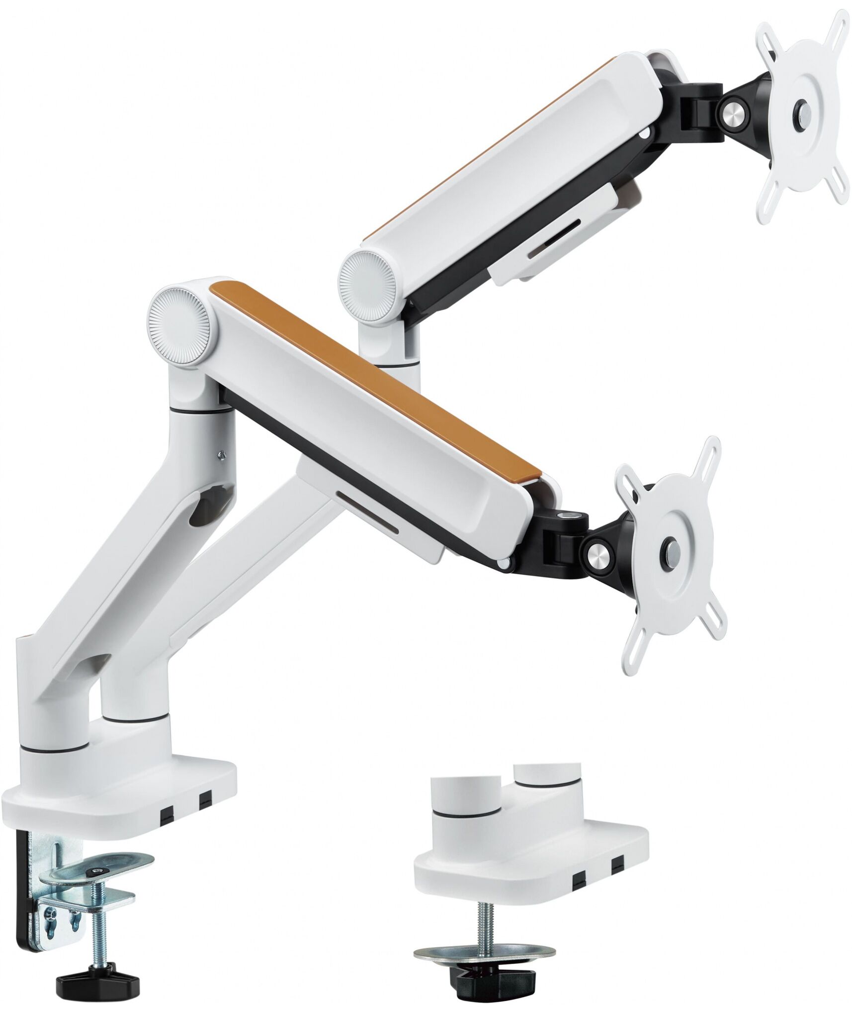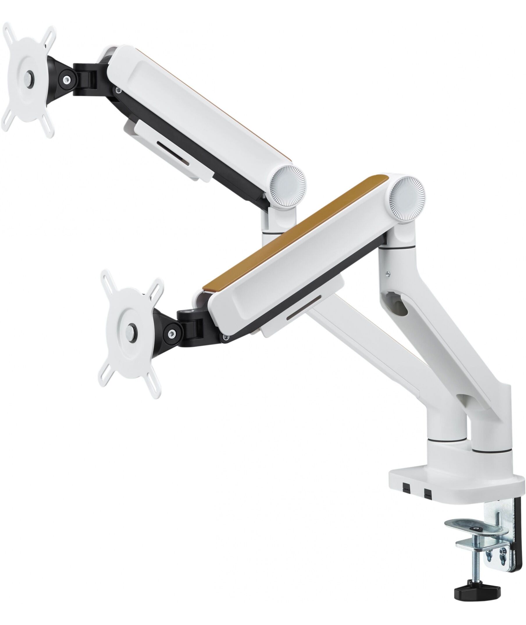 Настольный кронштейн для мониторов с системой газлифтов и встроенными пружинными механизмами для регулировки веса обеспечивает надежное крепление и позволяет изменять положение экранов по высоте и наклону.