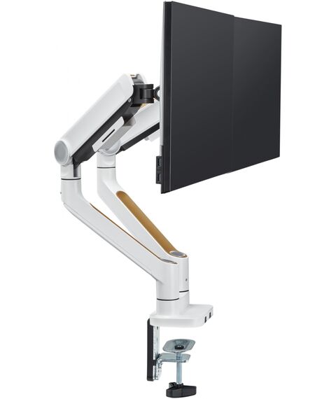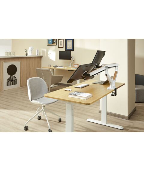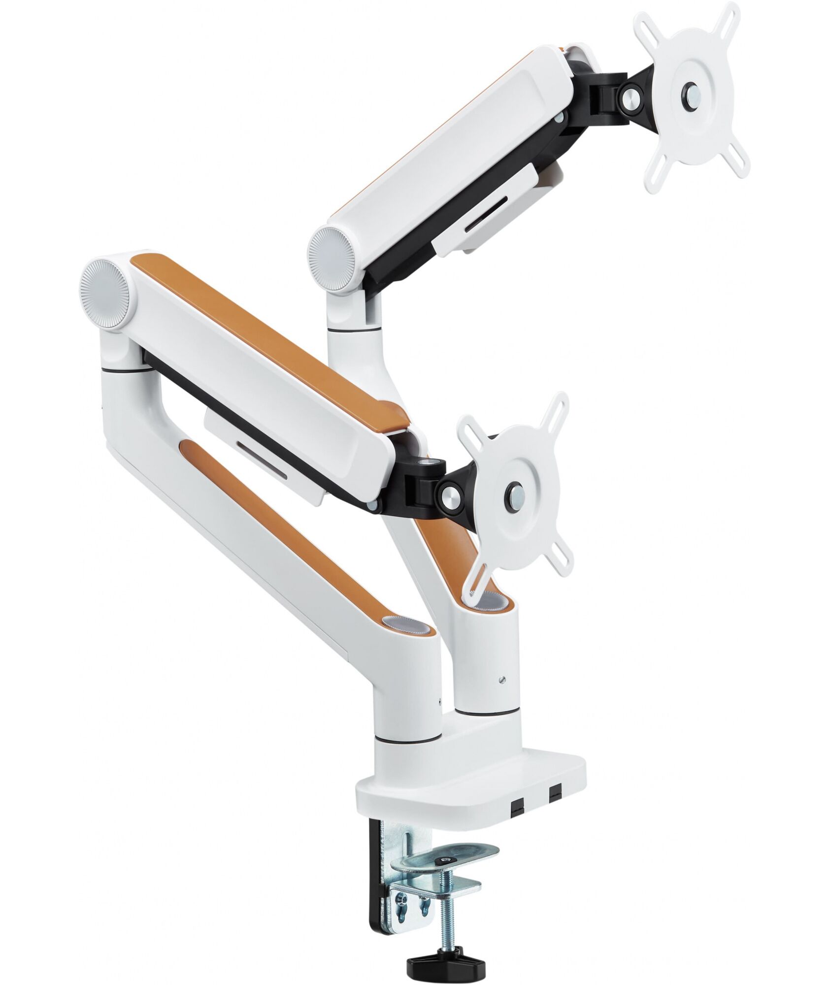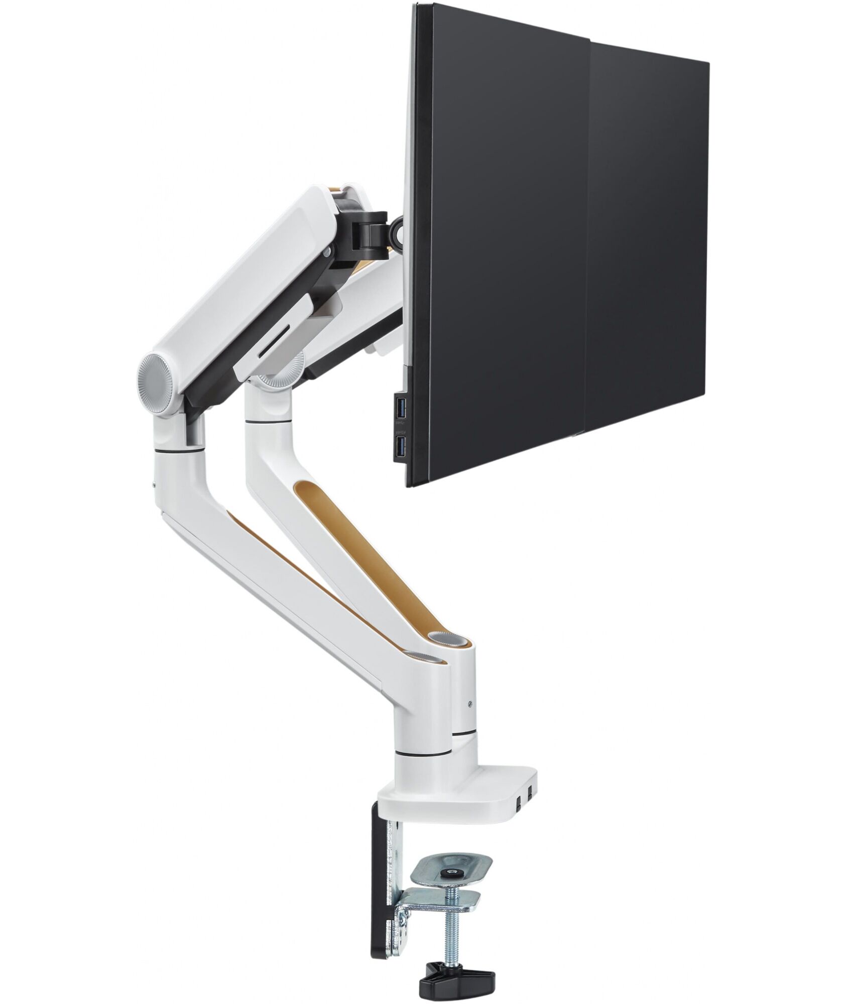Настольный кронштейн для мониторов с системой газлифтов и встроенными пружинными механизмами для регулировки веса обеспечивает надежное крепление и позволяет изменять положение экранов по высоте и наклону.