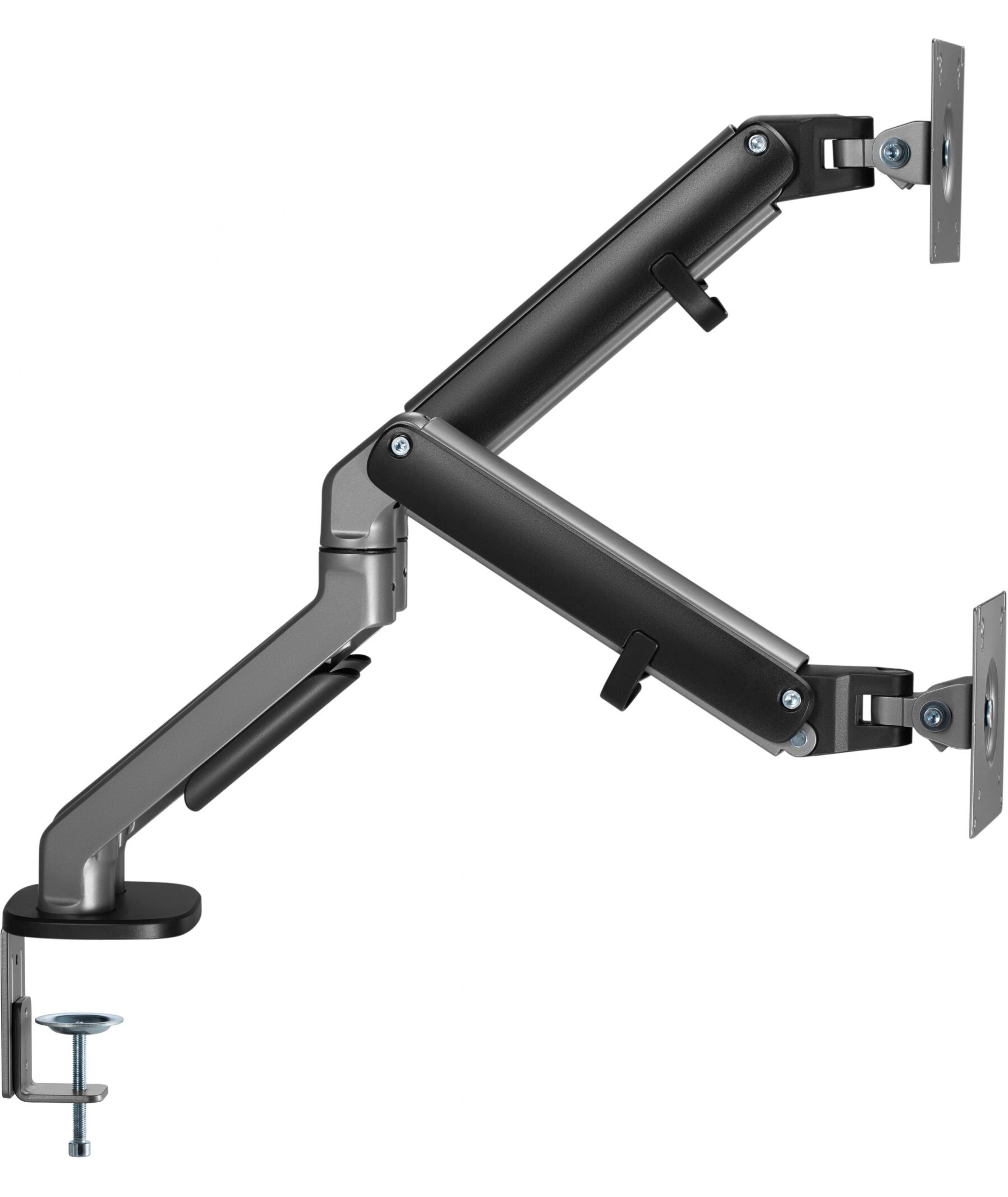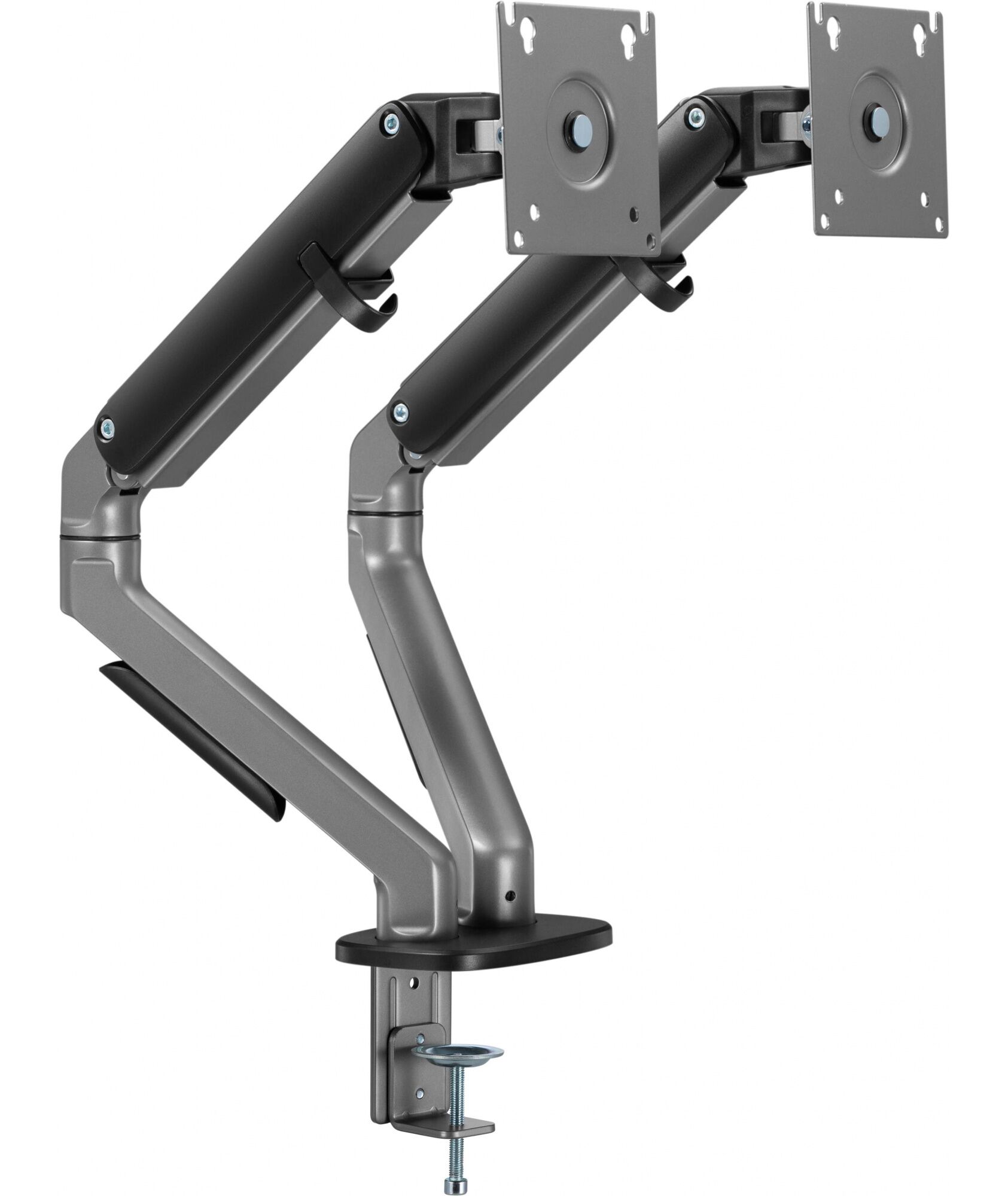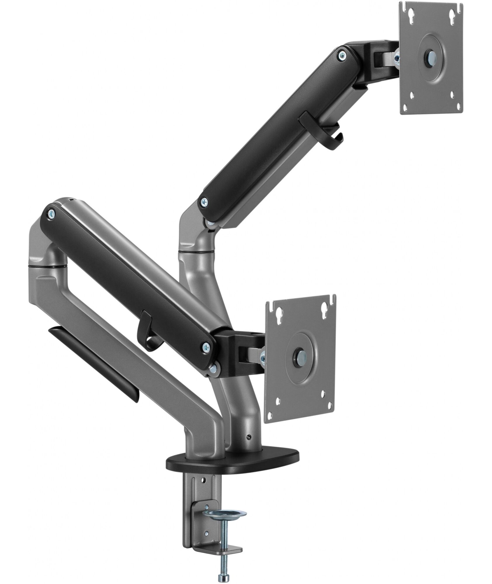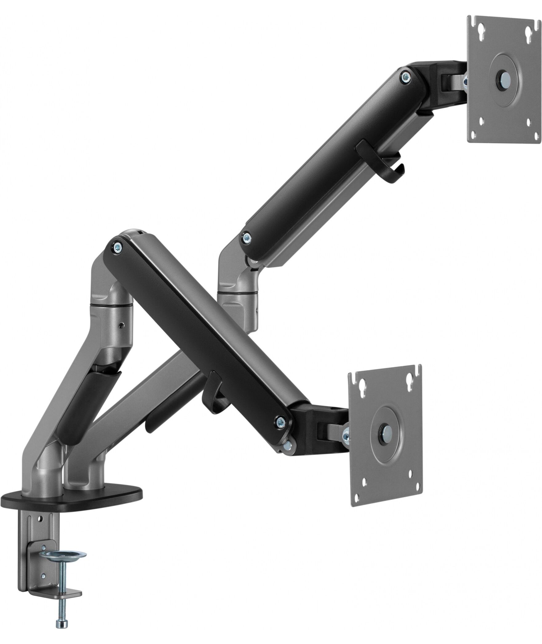 | Особенности | Настольный кронштейн с двумя креплениями под мониторы. Встроенный пружинный механизм натяжения поможет для идеальной регулировки веса. |