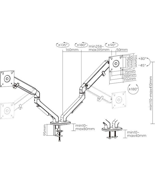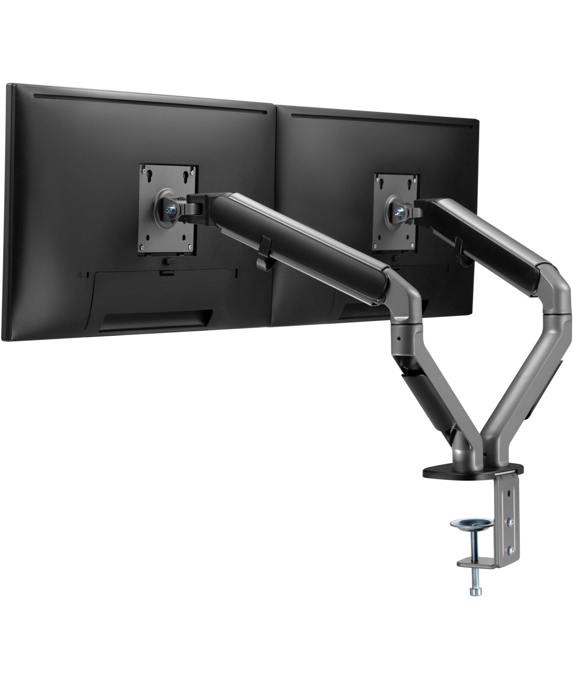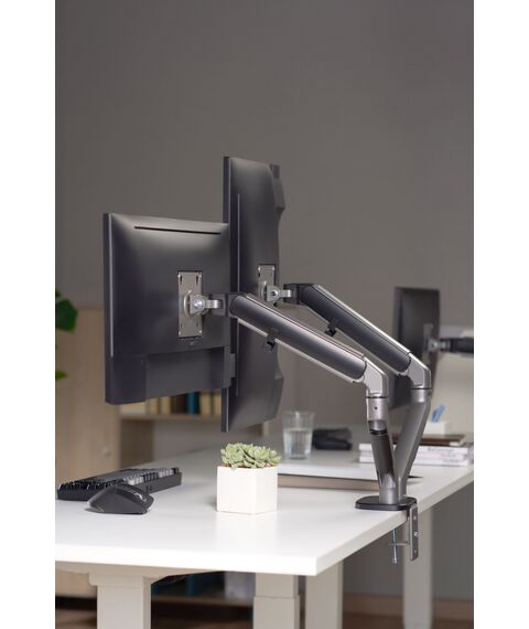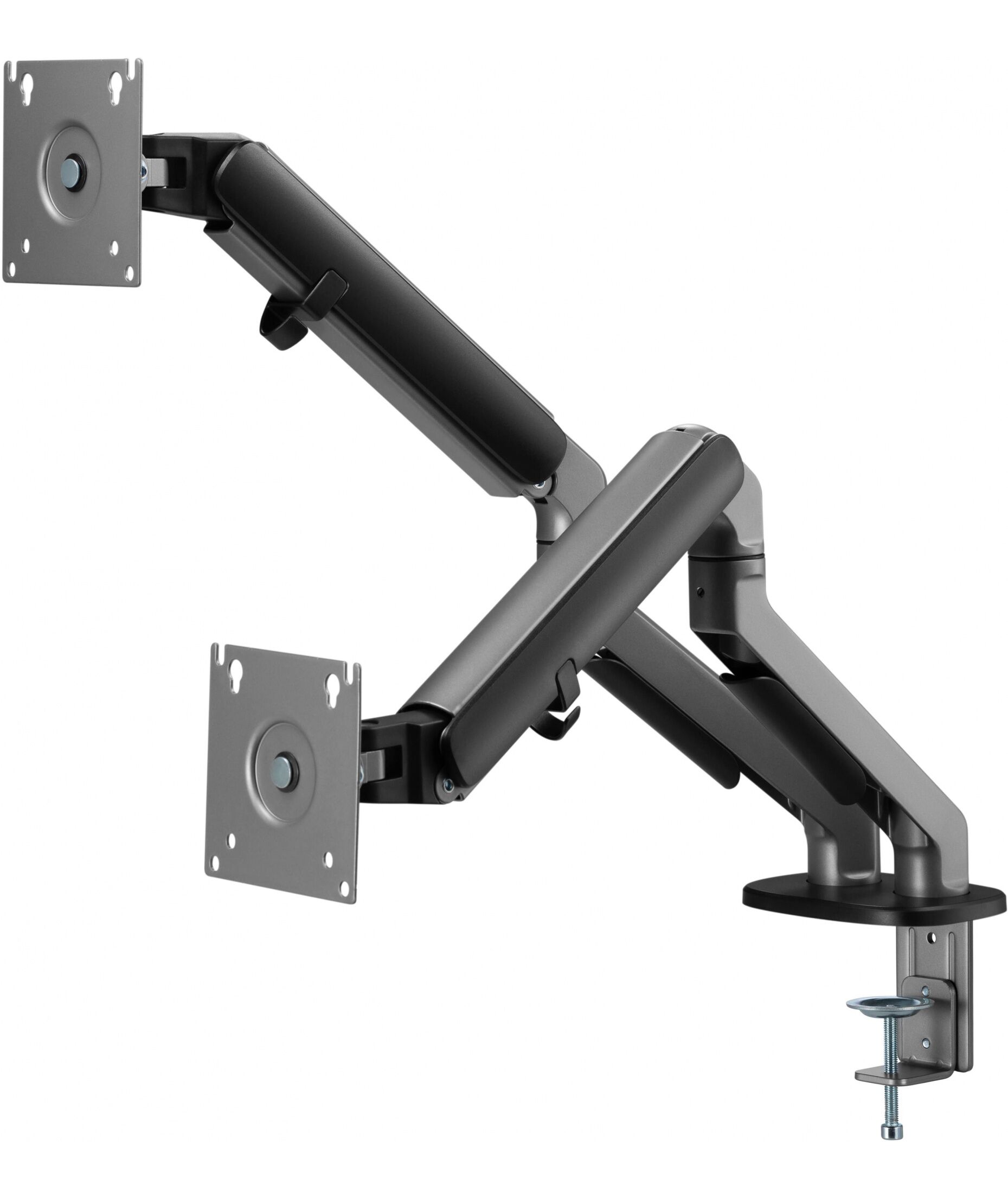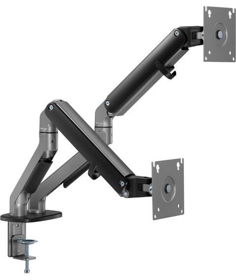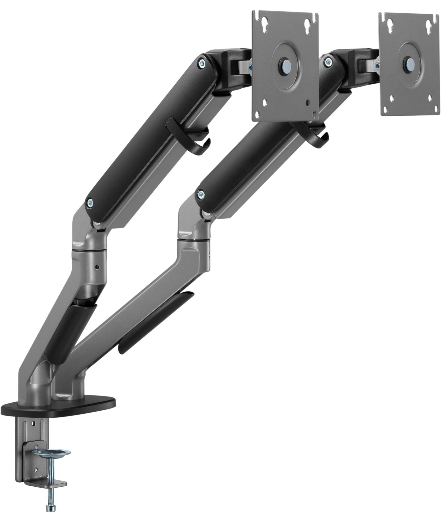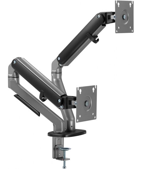 | Особенности | Настольный кронштейн с двумя креплениями под мониторы. Встроенный пружинный механизм натяжения поможет для идеальной регулировки веса. |