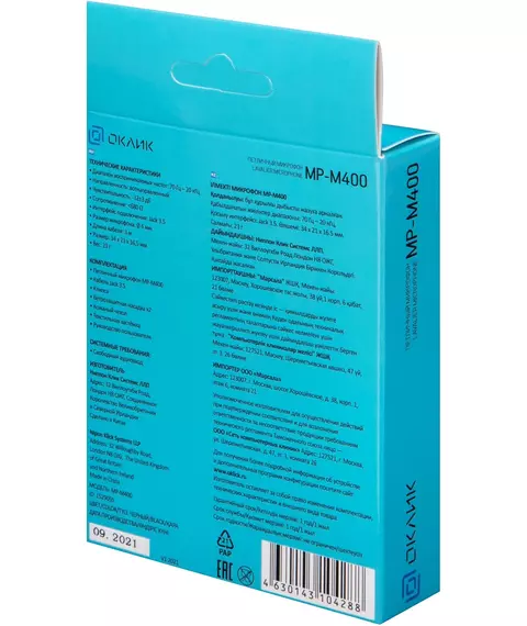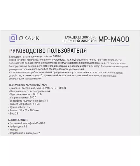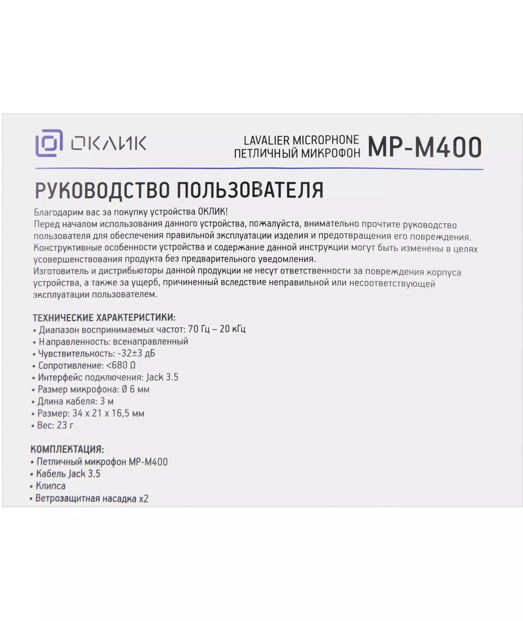 Микрофон Oklick MP-M400 проводной 3м черный [1529055]