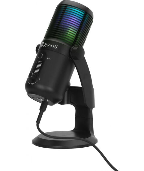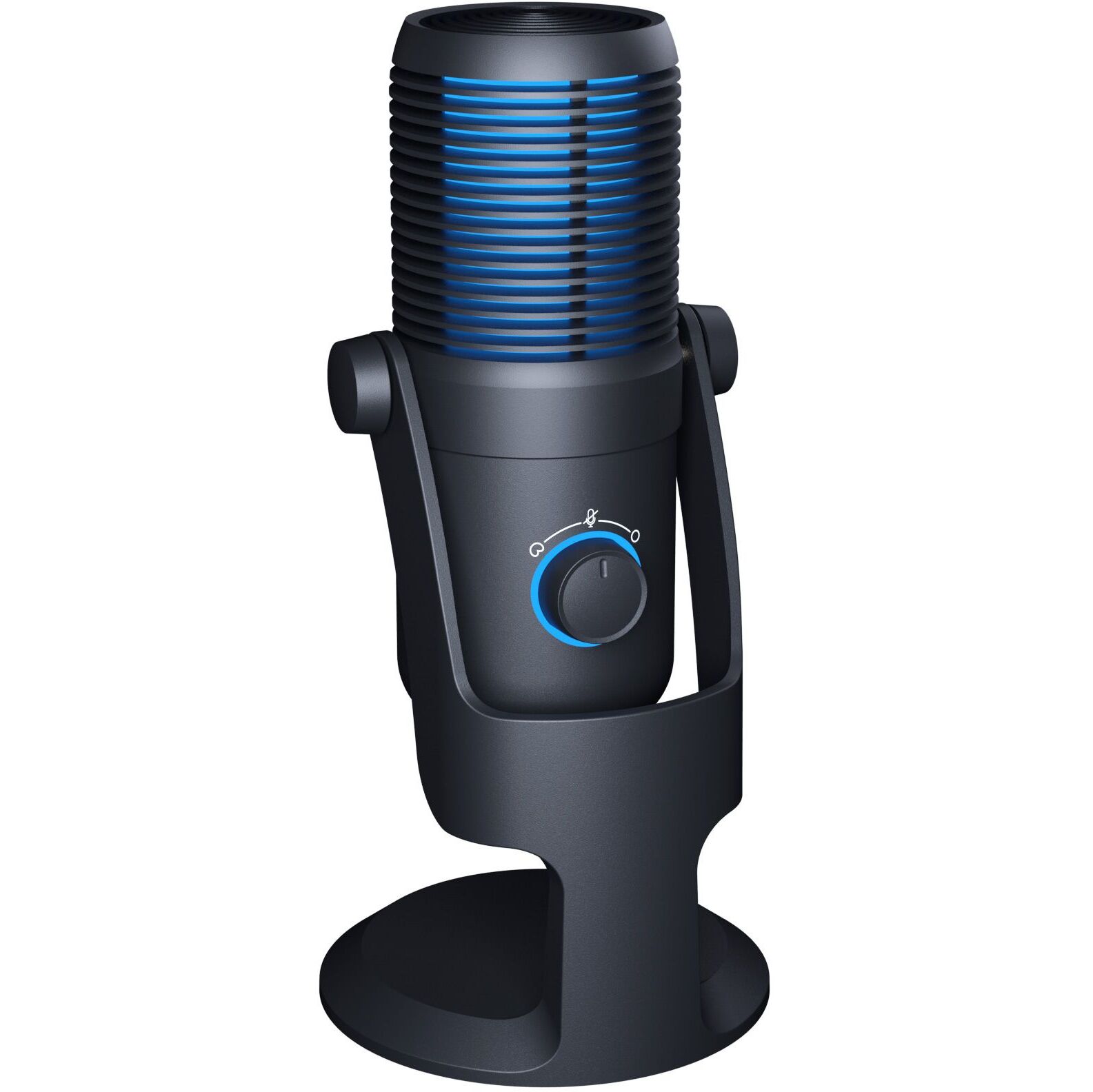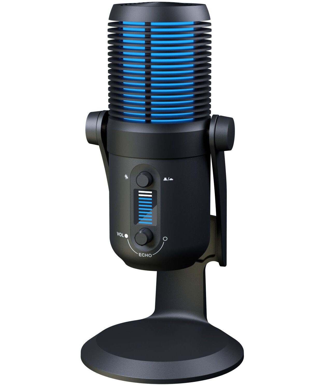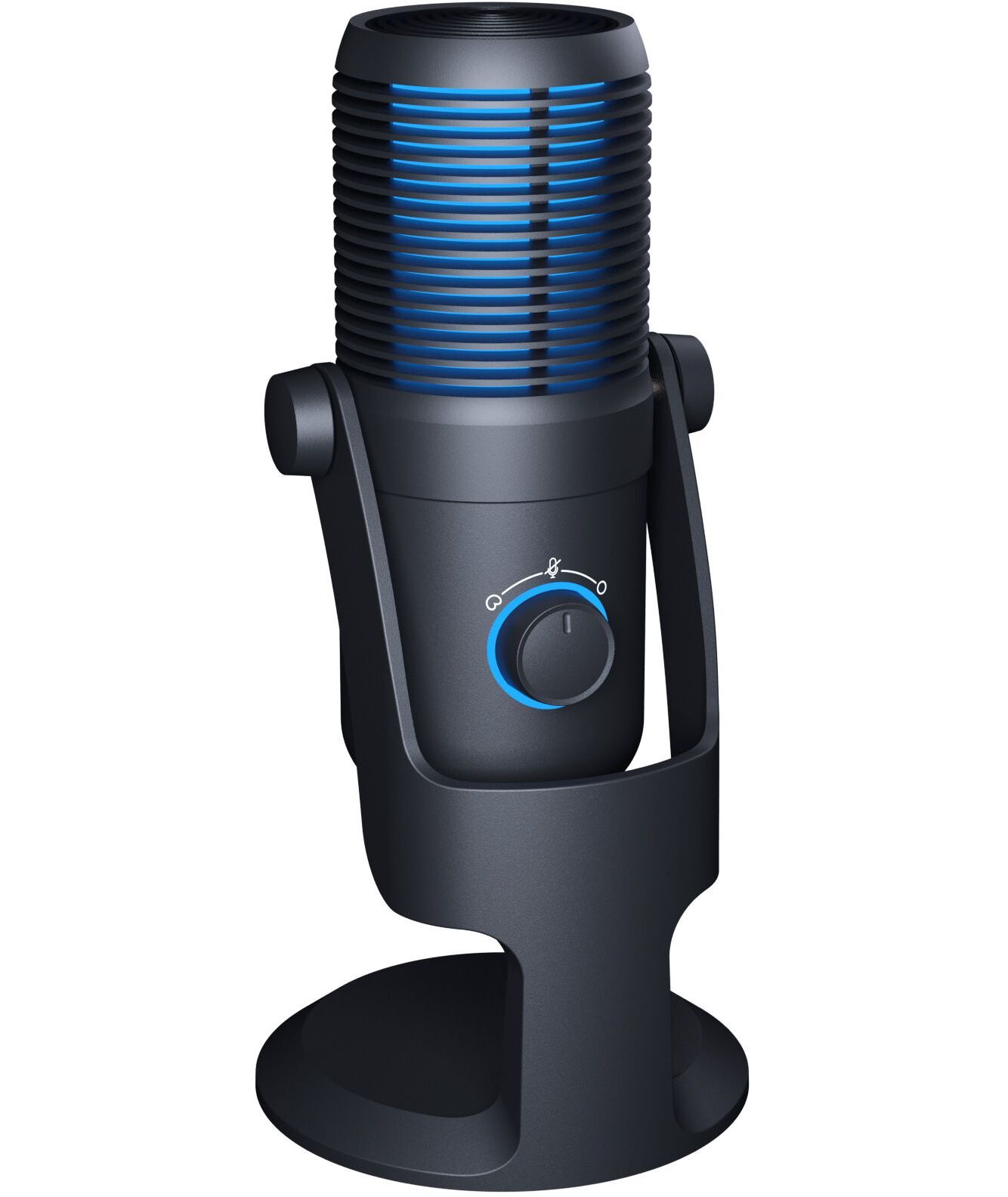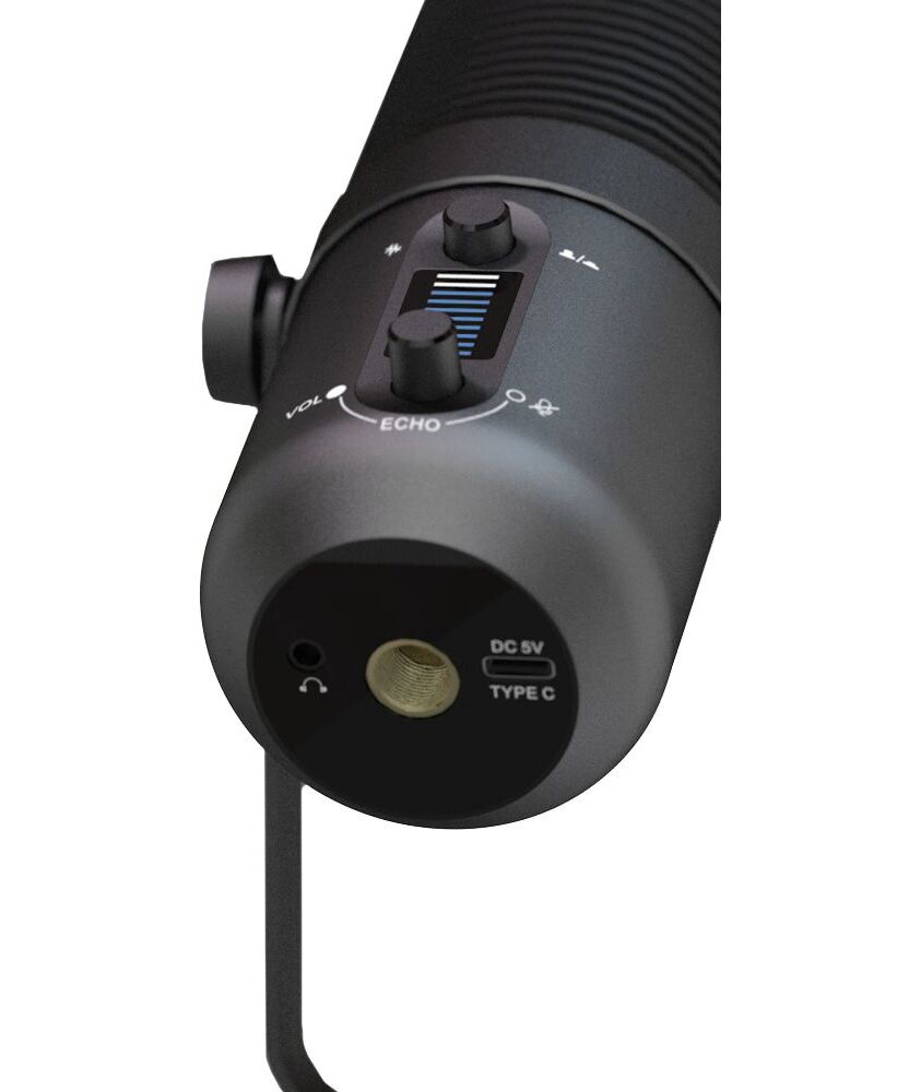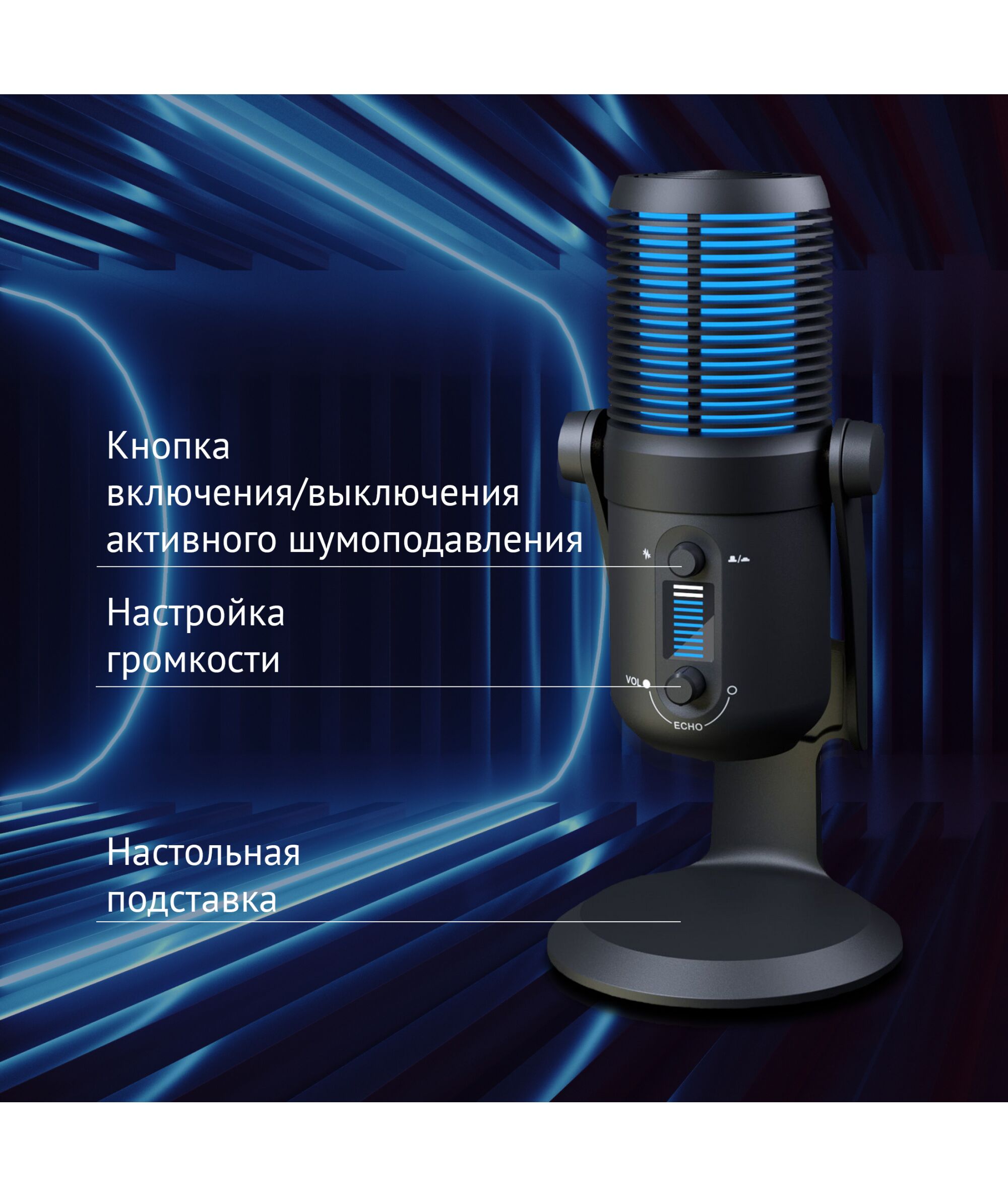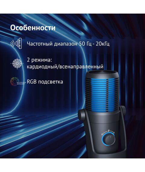 | Особенности | Микрофон с поддержкой режимов кардиодной и круговой направленности. Динамическая RGB подсветка. Кнопки регулировки громкости, направленности, функции отсечки сторонних шумов (ENC), TRRS (1*3.5 мм) вход для гарнитуры. Поключение к устройству - через съемный USB A-C кабель. Аудиоэффекты. |