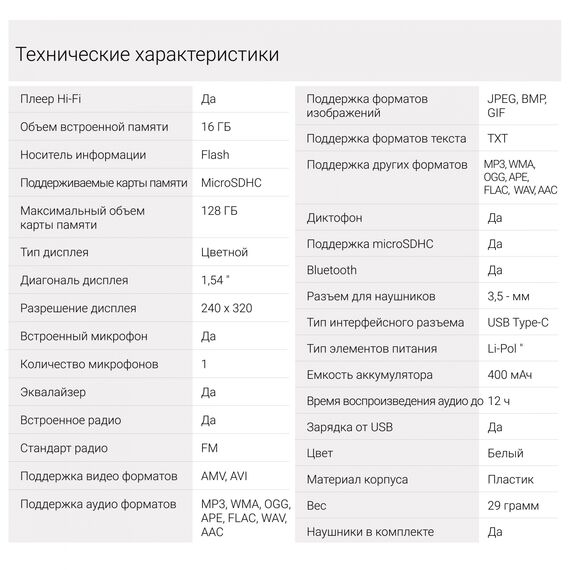 | Поддержка других форматов | MP3, WMA, OGG, APE, FLAC, WAV, AAC |