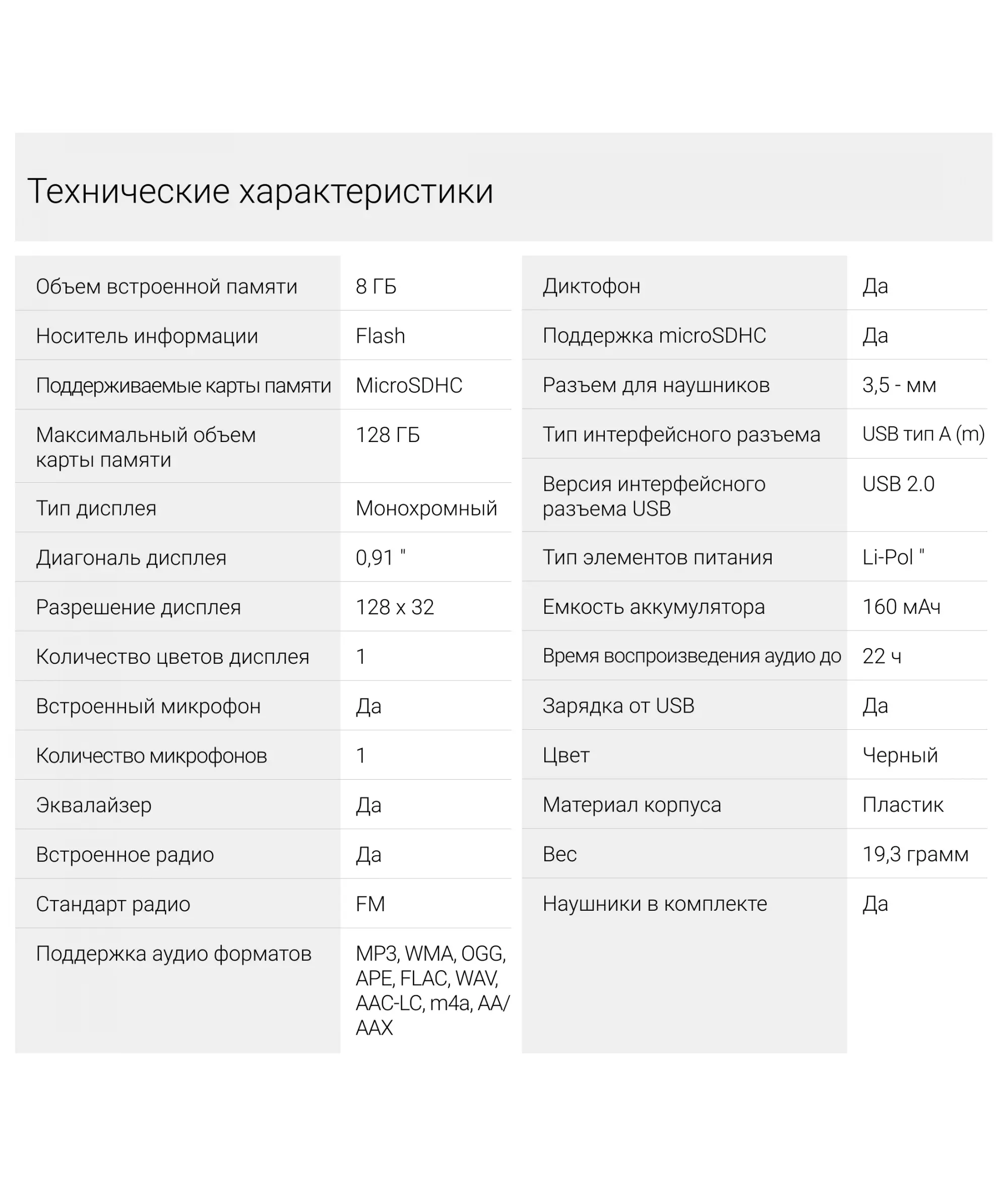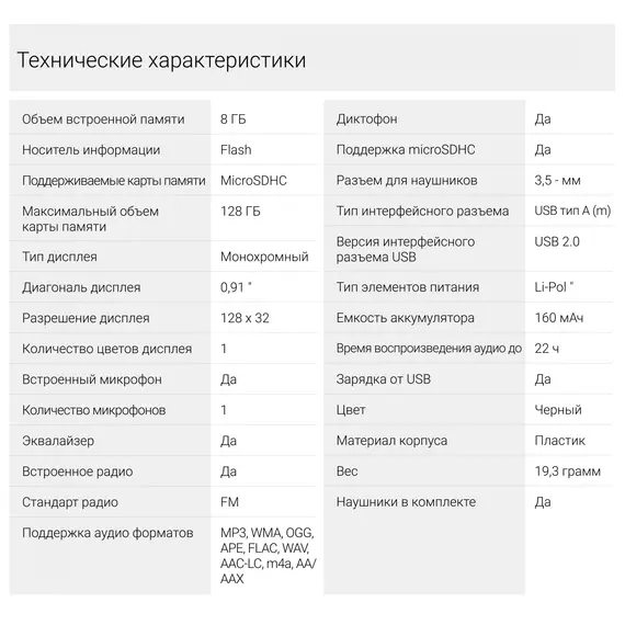 | Поддержка аудио форматов | MP3, WMA, OGG, APE, FLAC, WAV, AAC-LC, m4a, AA/AAX |