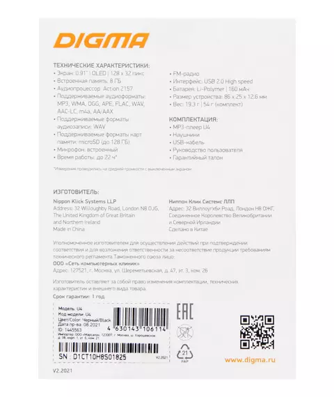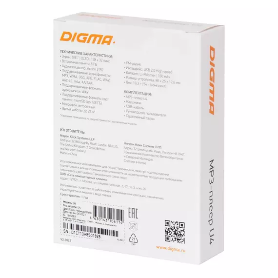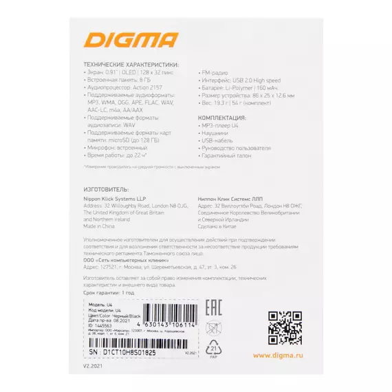 Плеер Flash Digma U4 8Gb черный/0.91"/FM/microSDHC [U4]