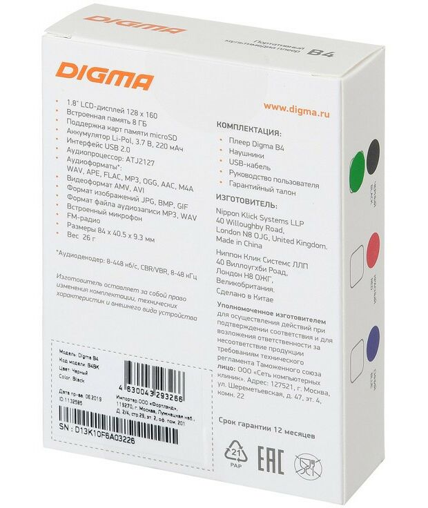 Проигрыватель Digma B4 MP3 Player, FM Tuner, 8Gb, MicroSD, LCD 1.8", диктофон, USB, Li-Pol [B4BK-Black]