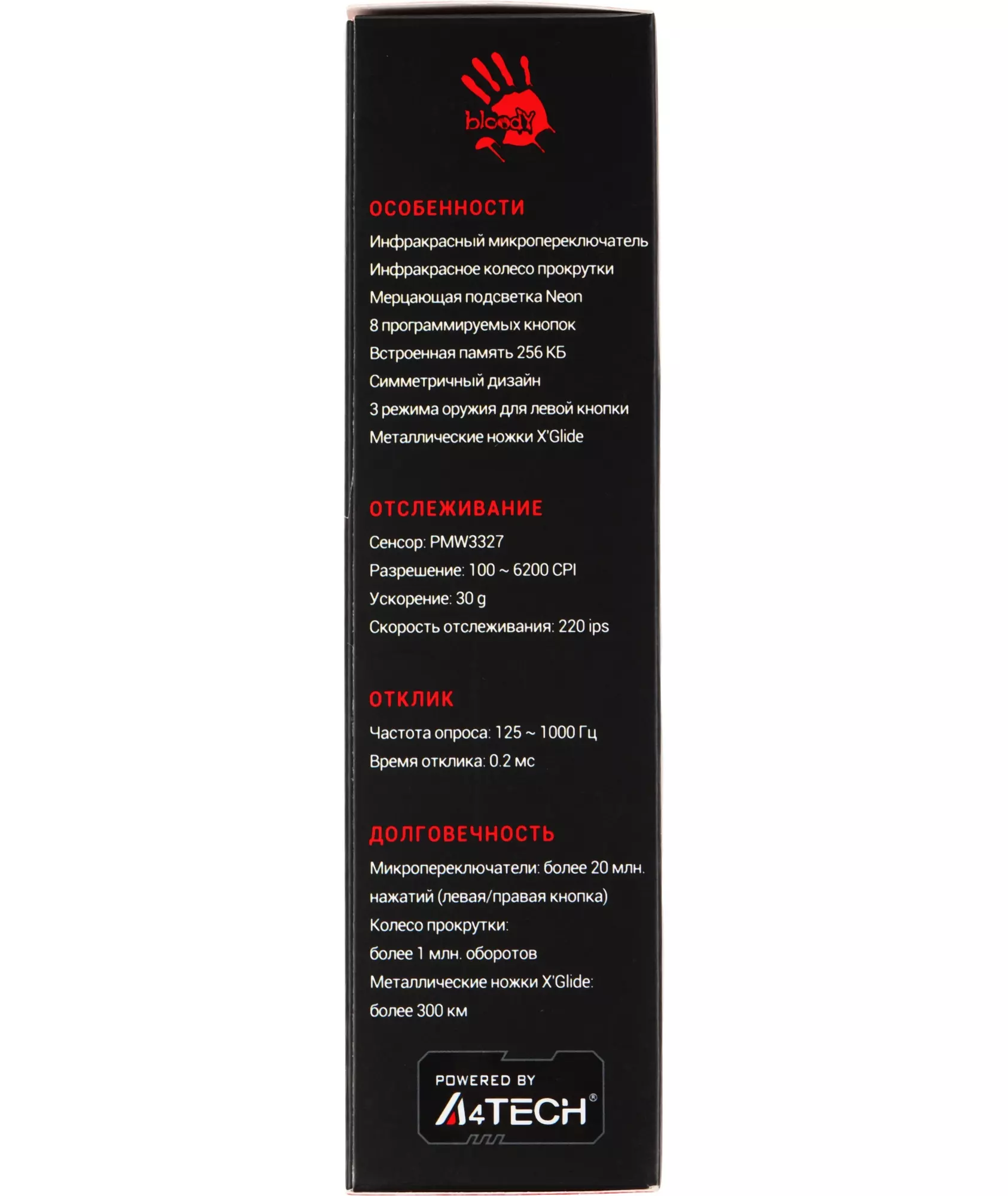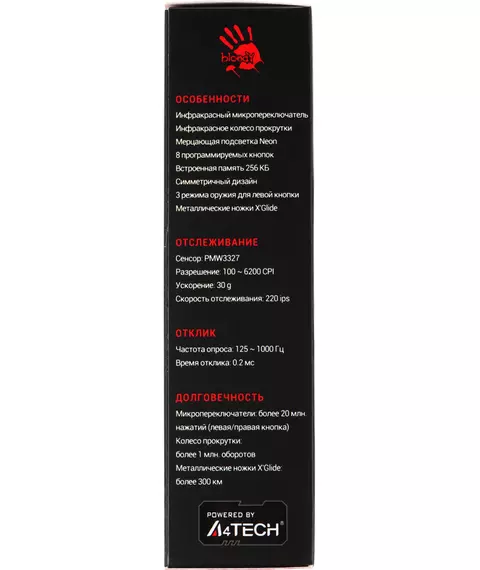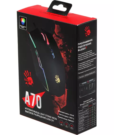 | Особенности | Молниеносный отклик. Время отклика – до 0.2 мс. Высокая долговечность - более 20 млн нажатий. Отсутствие металлического дребезжания при нажатии. Используются переключатели LK. Подсветка рисунка Neon. Игровой сенсор Pixart PMW3327. поддержка функции Drug click |