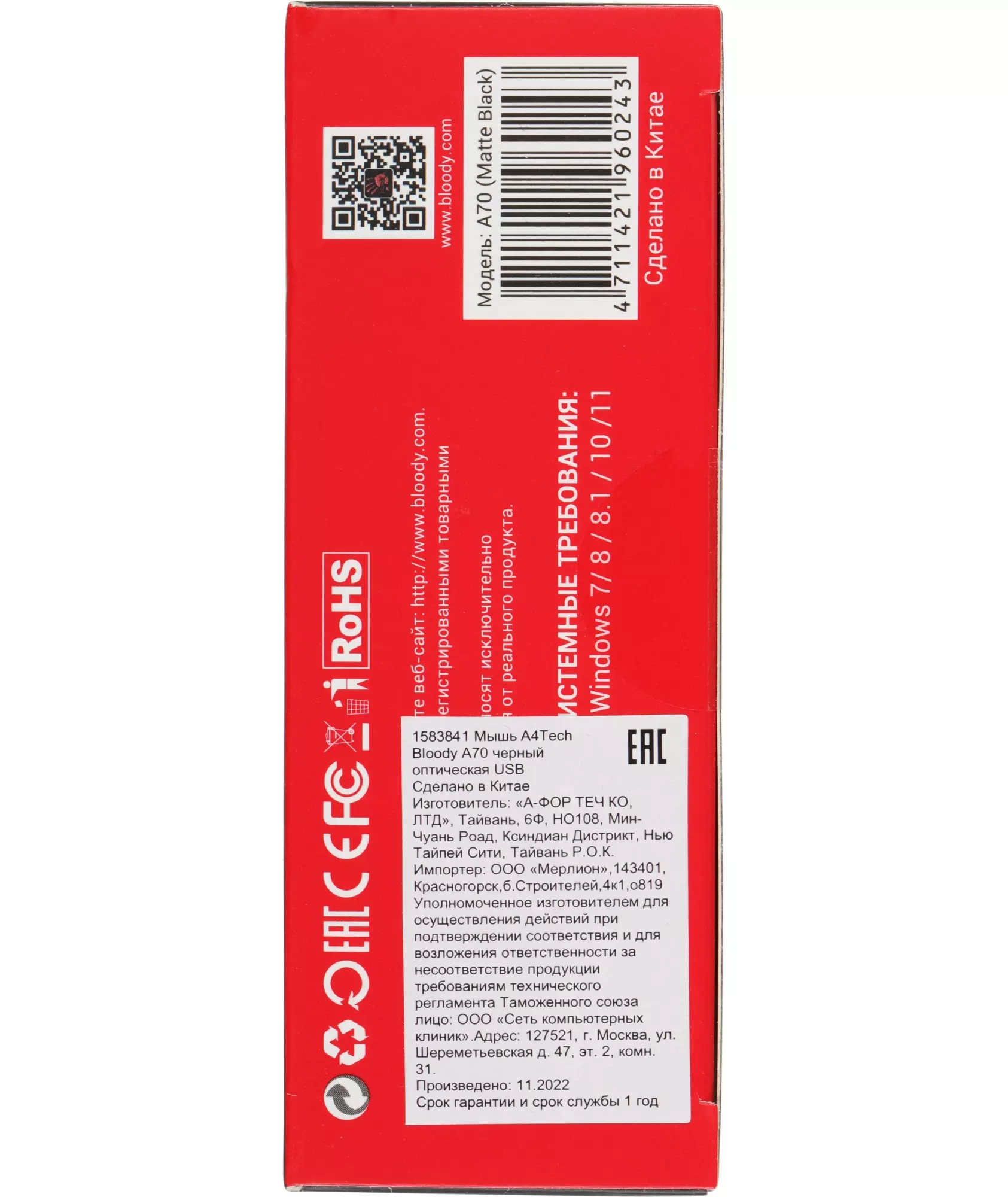 Наличие товара A4-Tech Bloody A70 MATTE BLACK