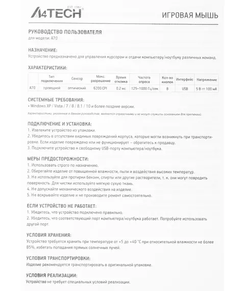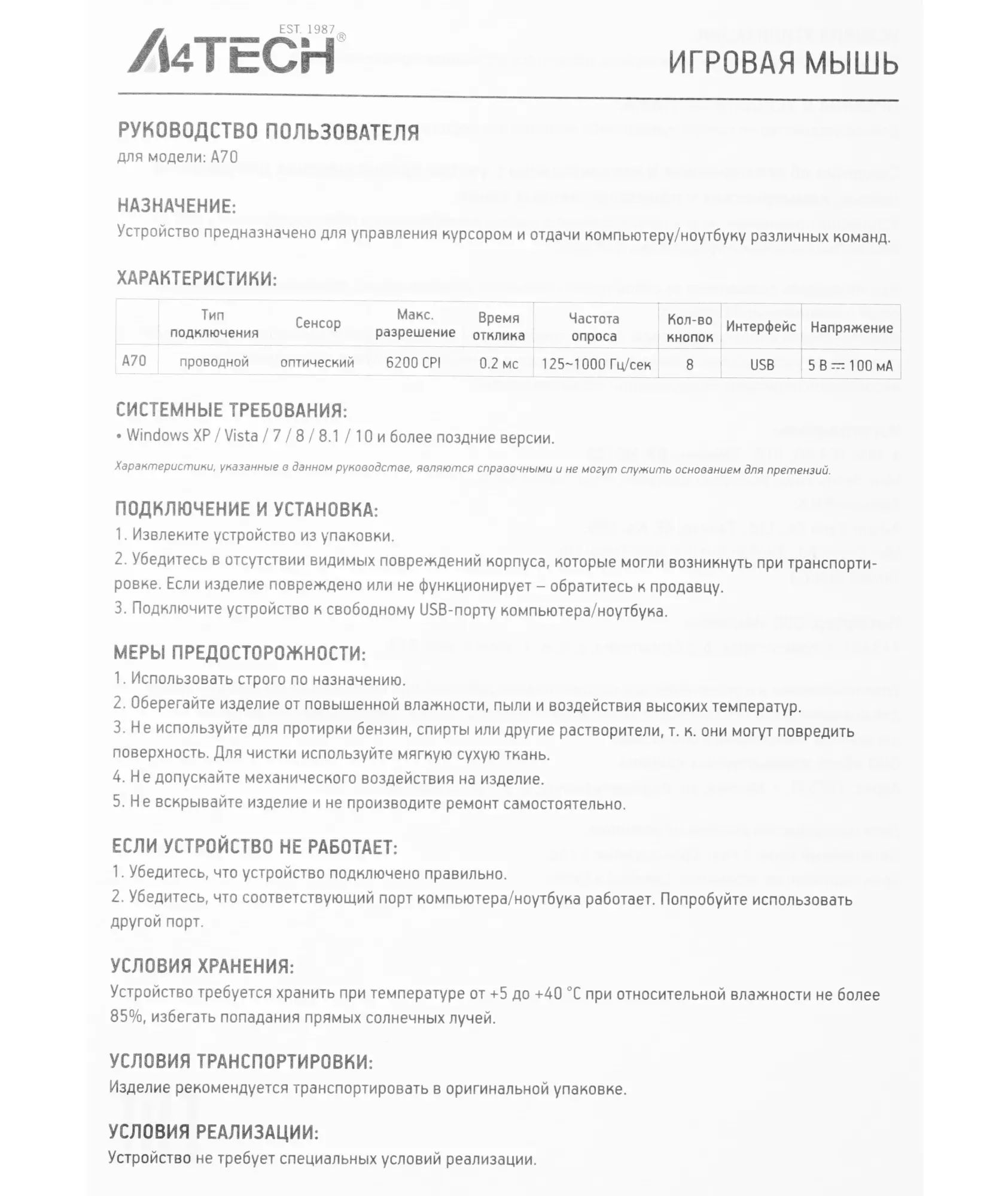 Описание A4-Tech Bloody A70 MATTE BLACK