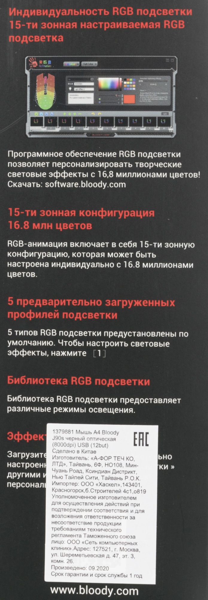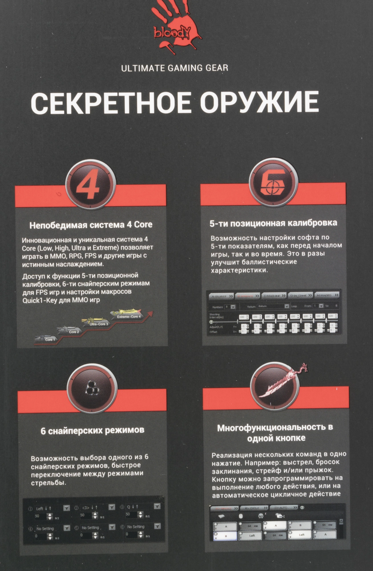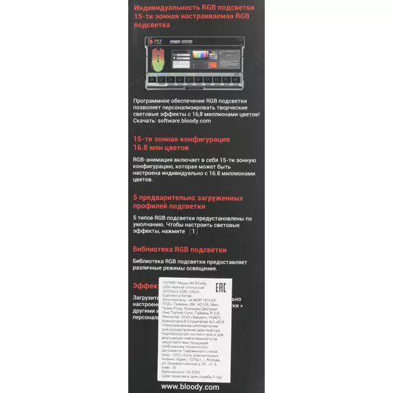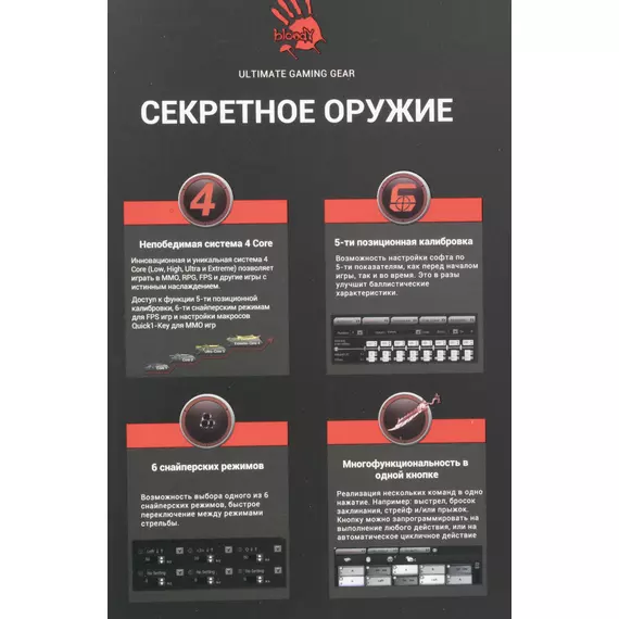 | Особенности | При установке ПО Bloody7, уровни core3,4 активированы бесплатно.15-ти зонная RGB подсветка5 эффектов подсветкиДополнительная кнопка FireВстроенная память 256K6 режимов стрельбы для левой кнопкиМеталлические ножки X' Glide |
