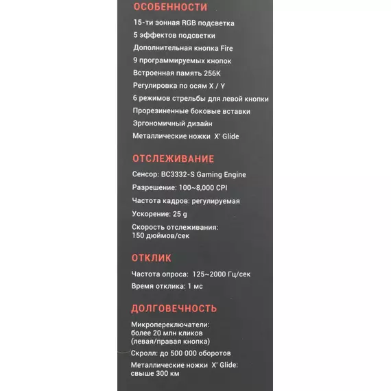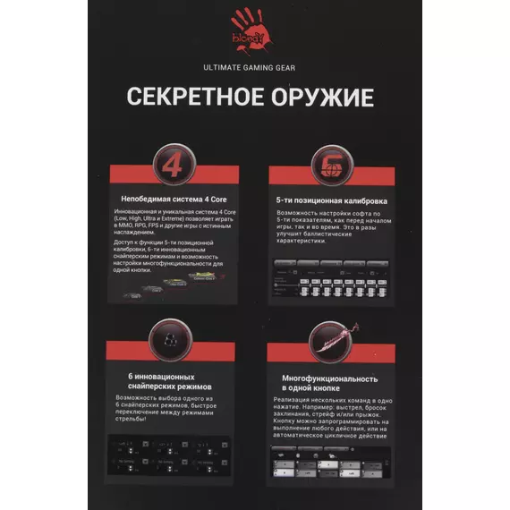 | Особенности | Сенсор: BC3332-S Gaming Engine15-ти зонная RGB-подсветка5 эффектов подсветкиДополнительная кнопка FireВстроенная память 256K6 режимов стрельбы для левой кнопкипри установке ПО Bloody7, уровни core3,4 активированы бесплатно |
