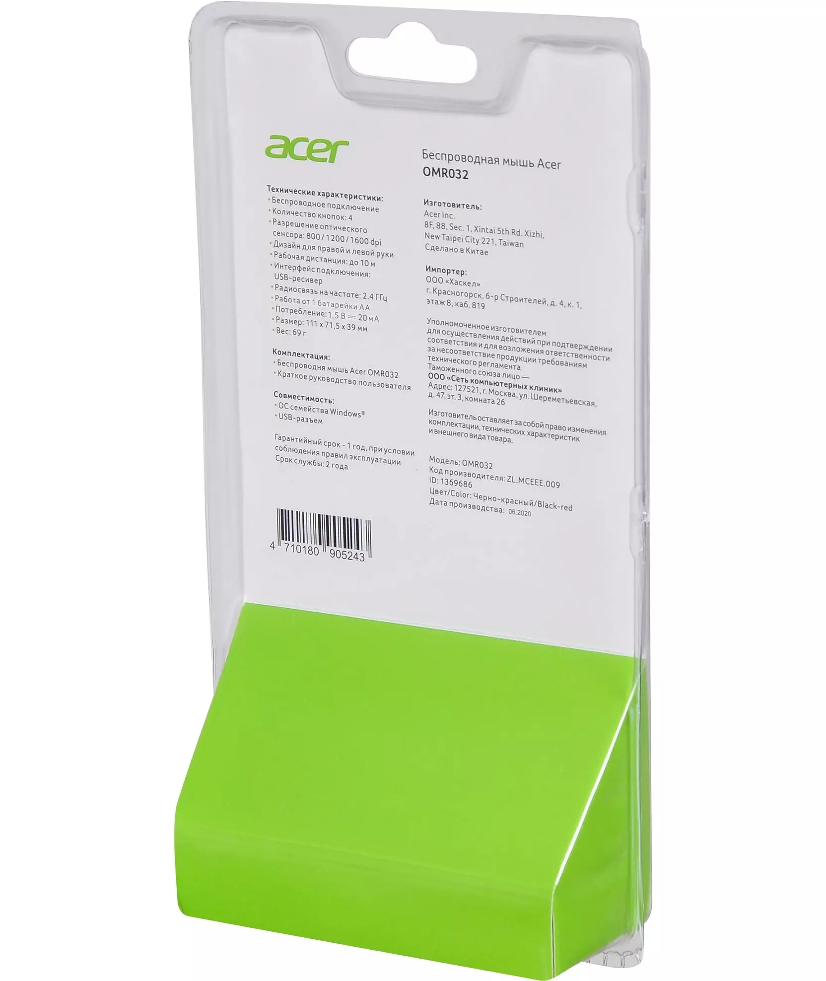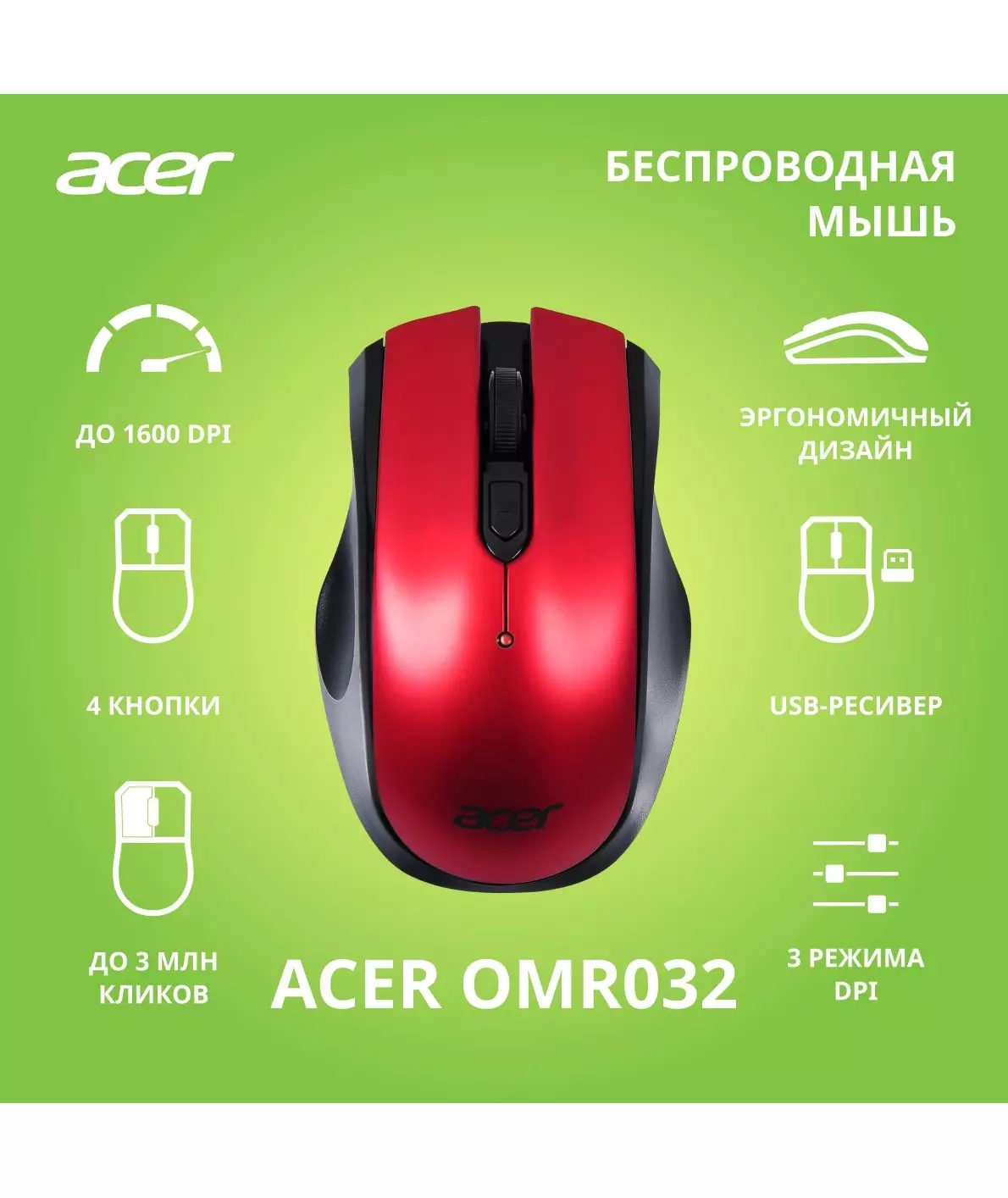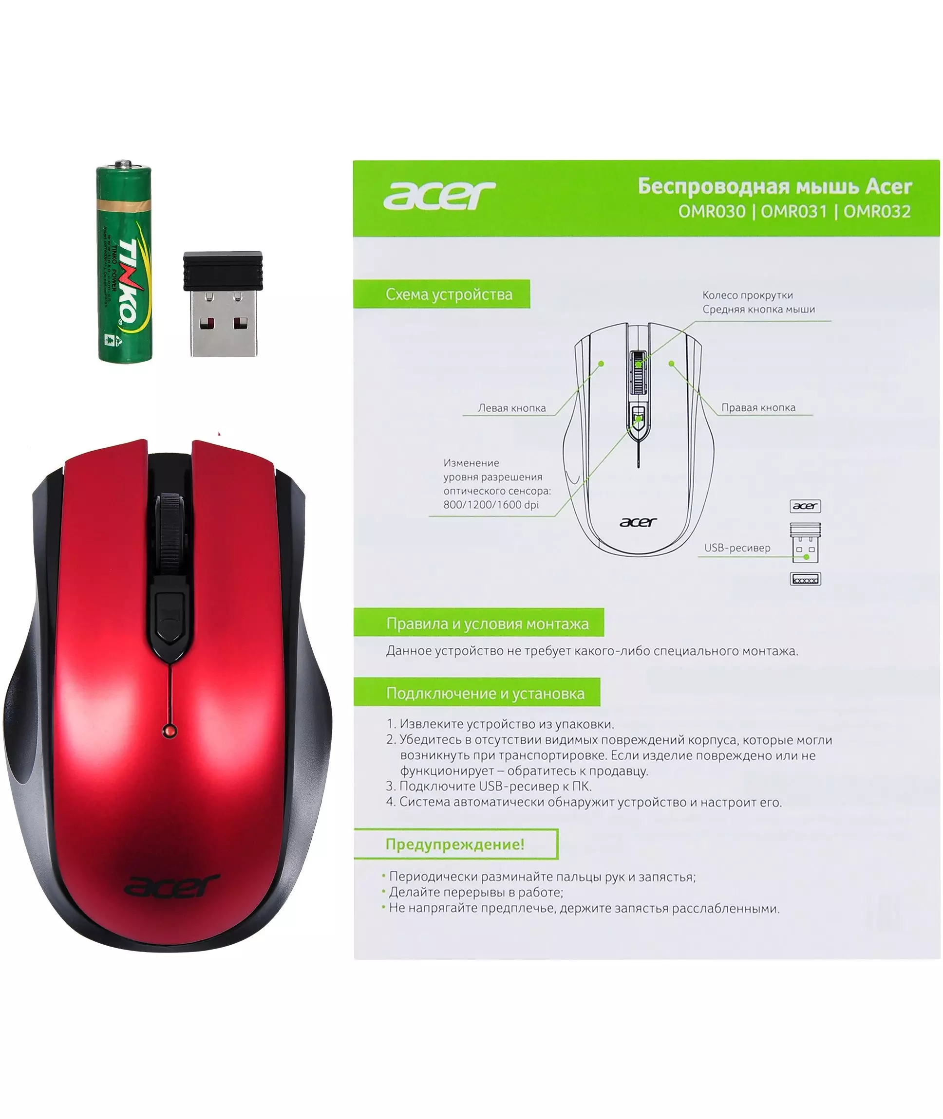 Мышь Acer OMR032 черный/красный оптическая 1600dpi беспров. USB 3but [ZL.MCEEE.009]