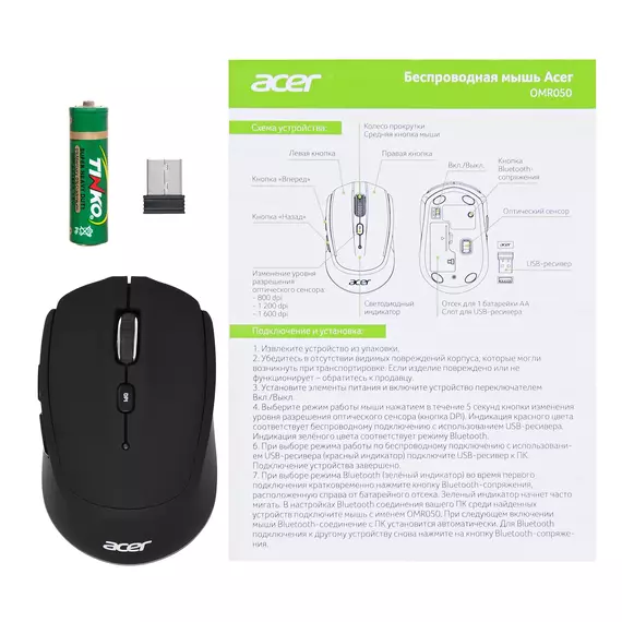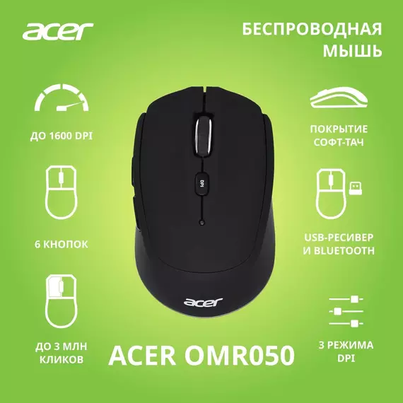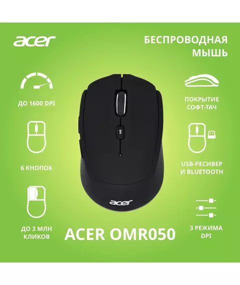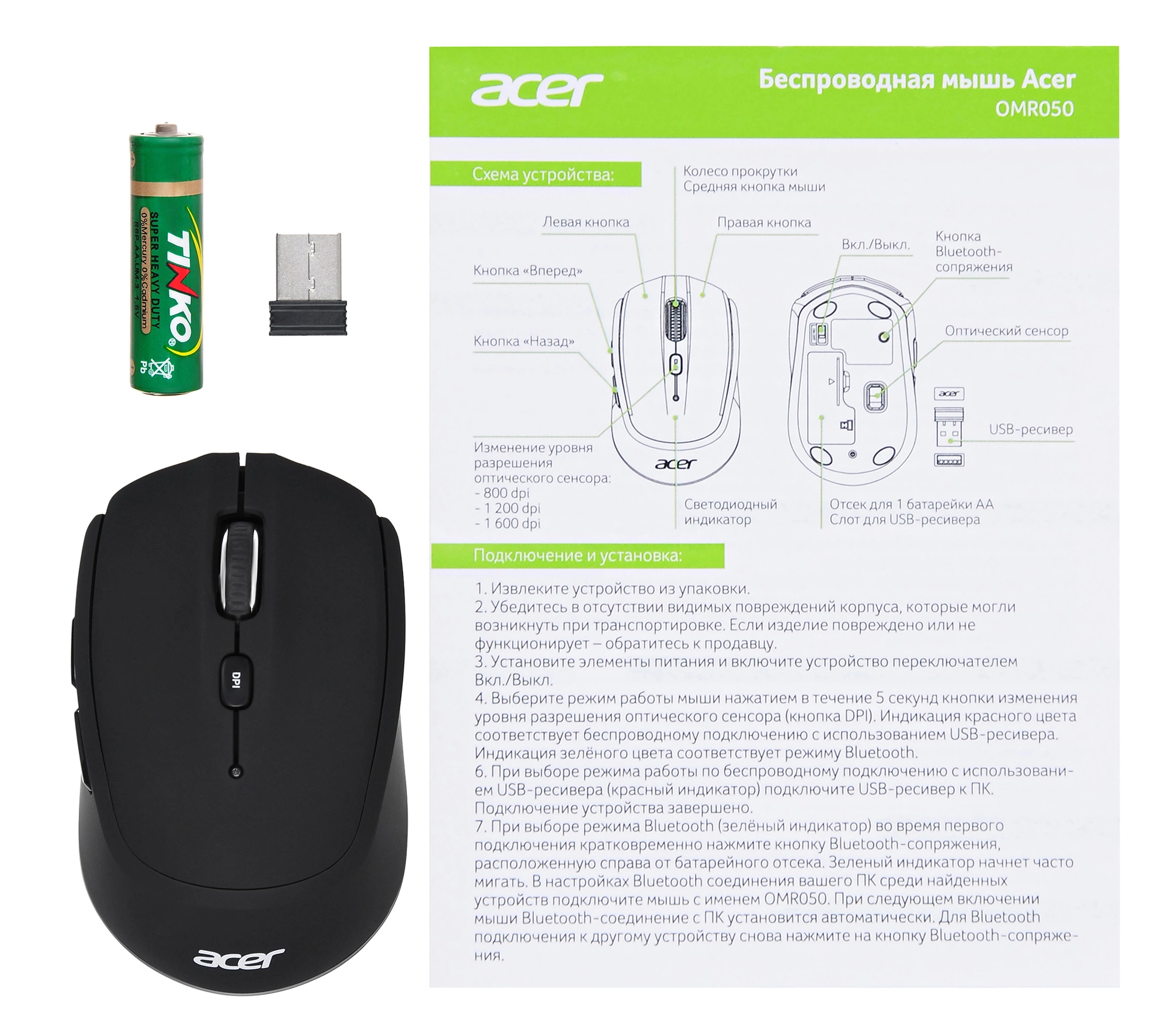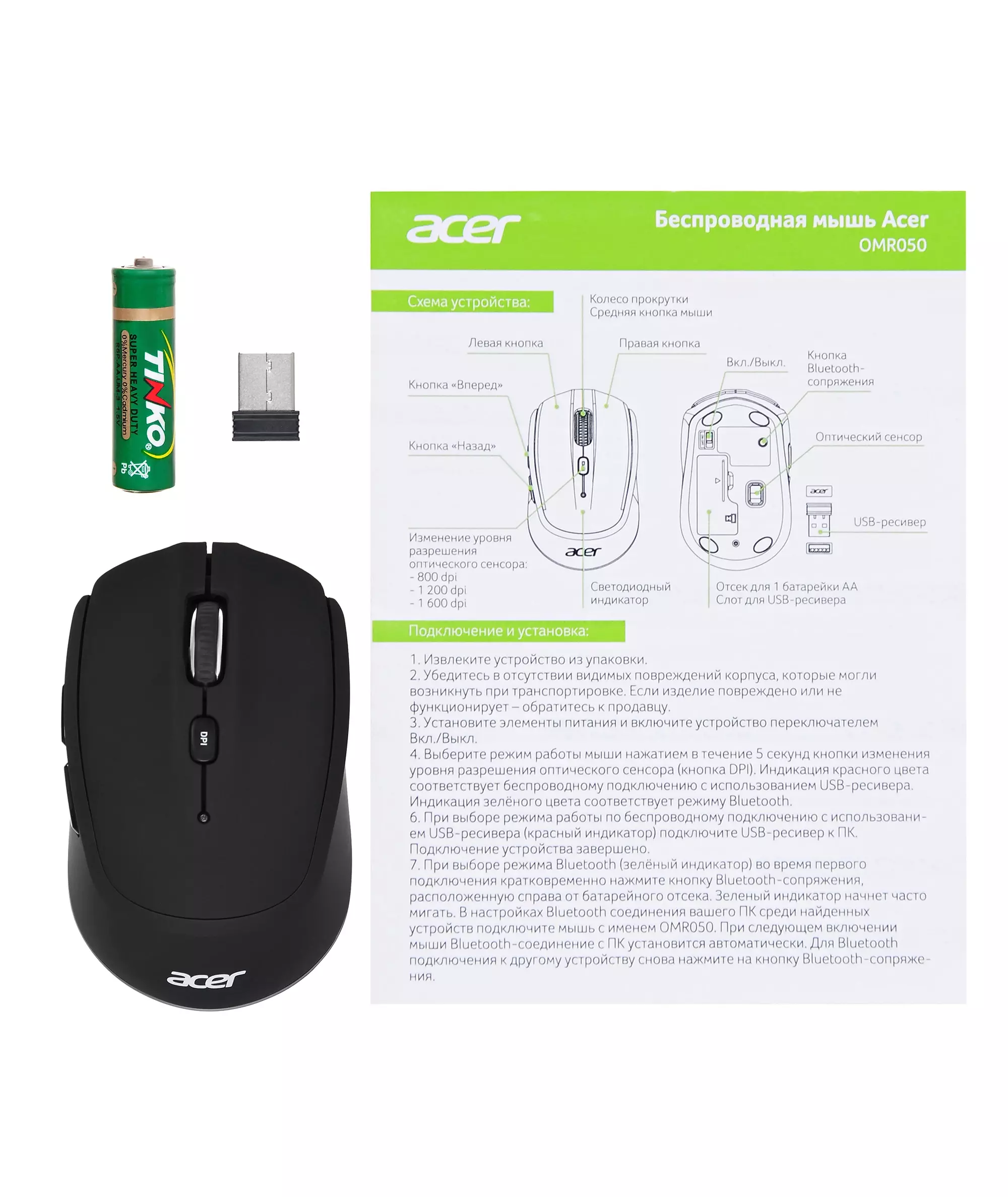 Мышь Acer OMR050 черный оптическая 1600dpi беспров. BT/Radio USB 6but [ZL.MCEEE.00B]