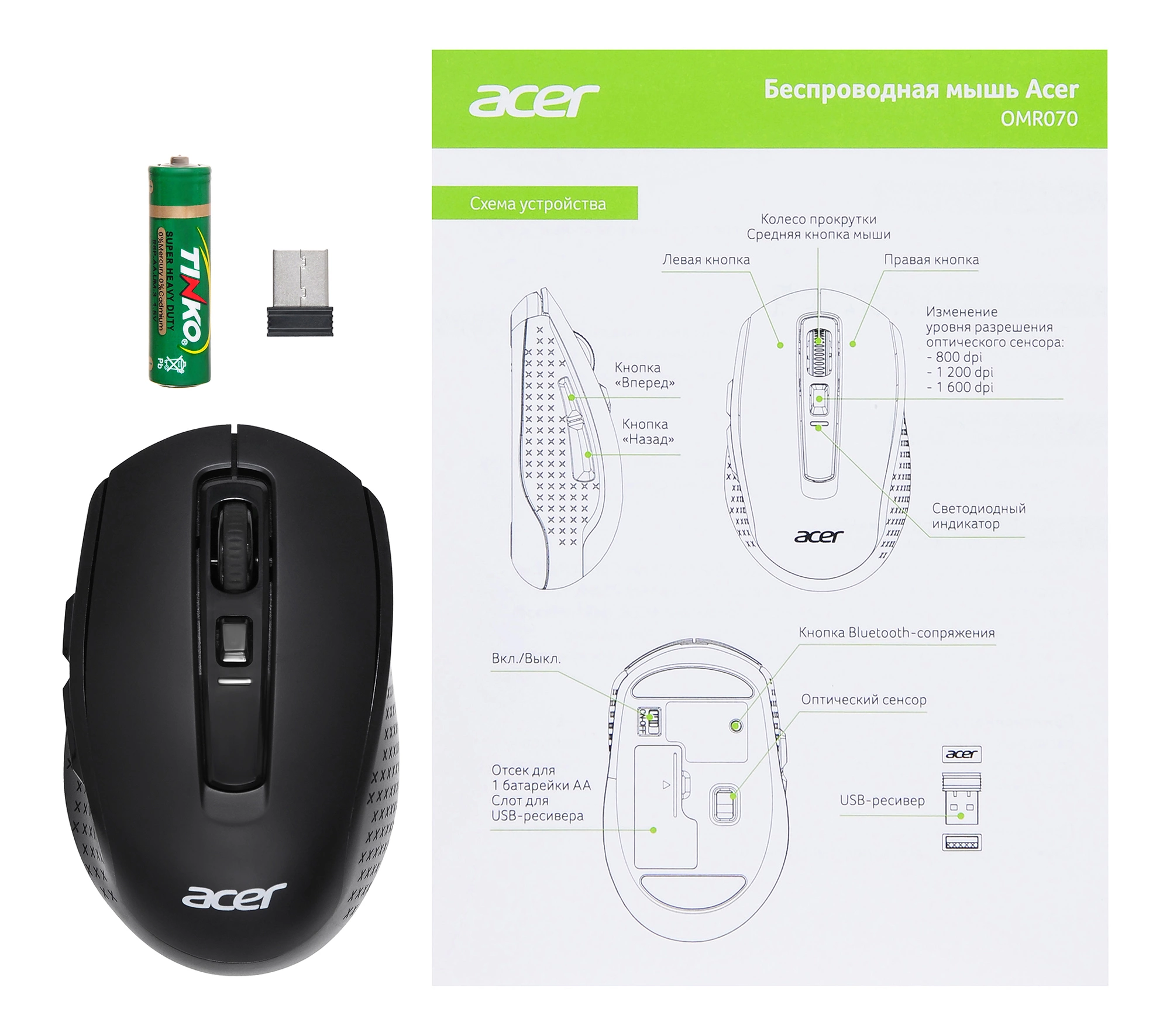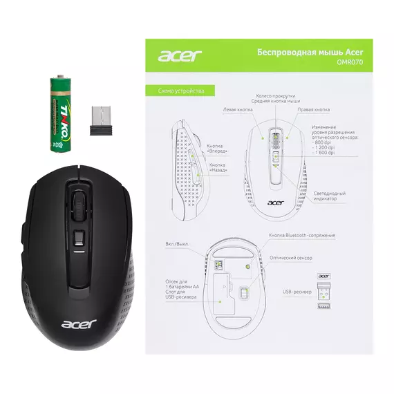 Мышь Acer OMR070 черный оптическая 1600dpi беспров. BT/Radio USB для ноутбука 6but [ZL.MCEEE.00D]
