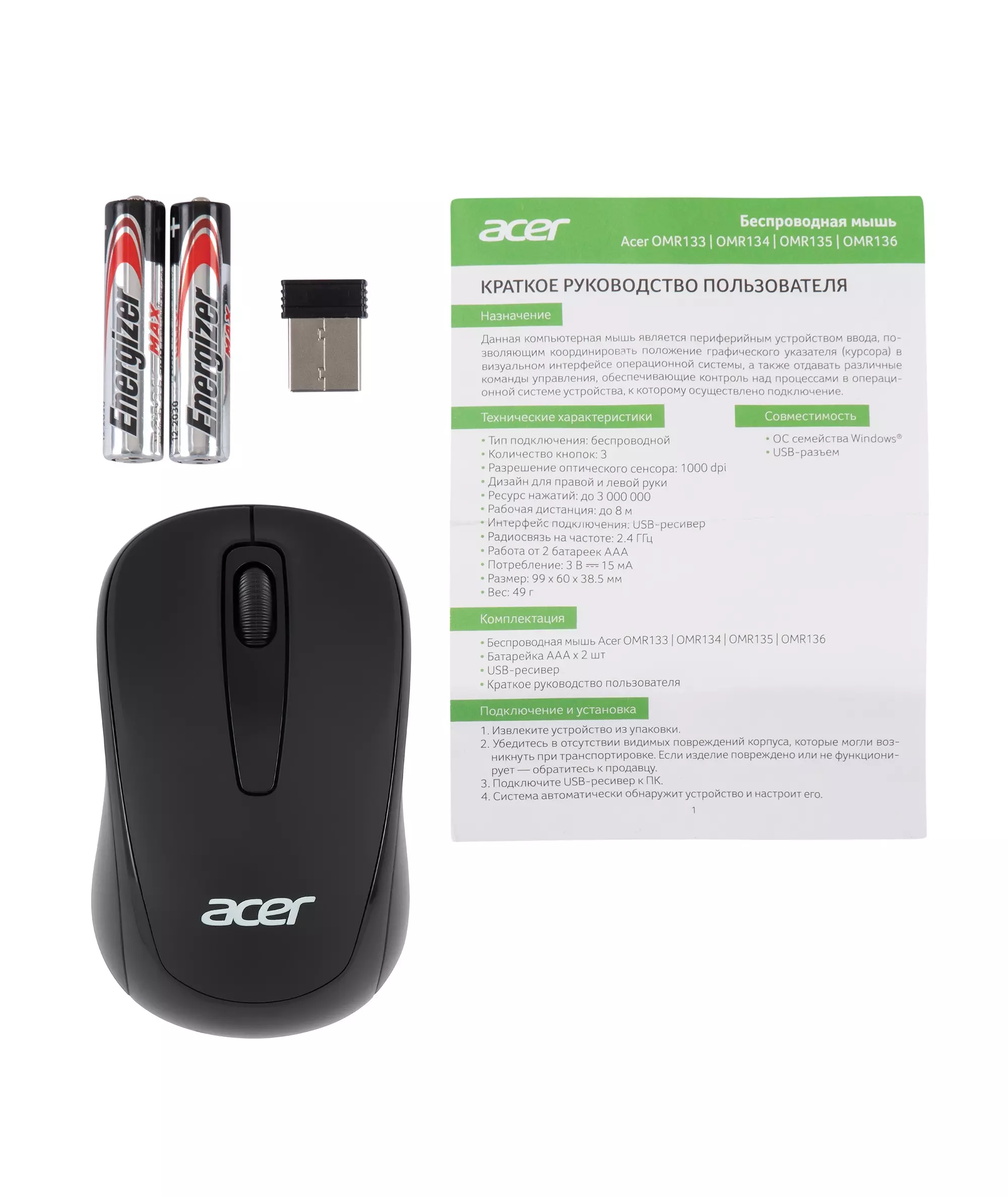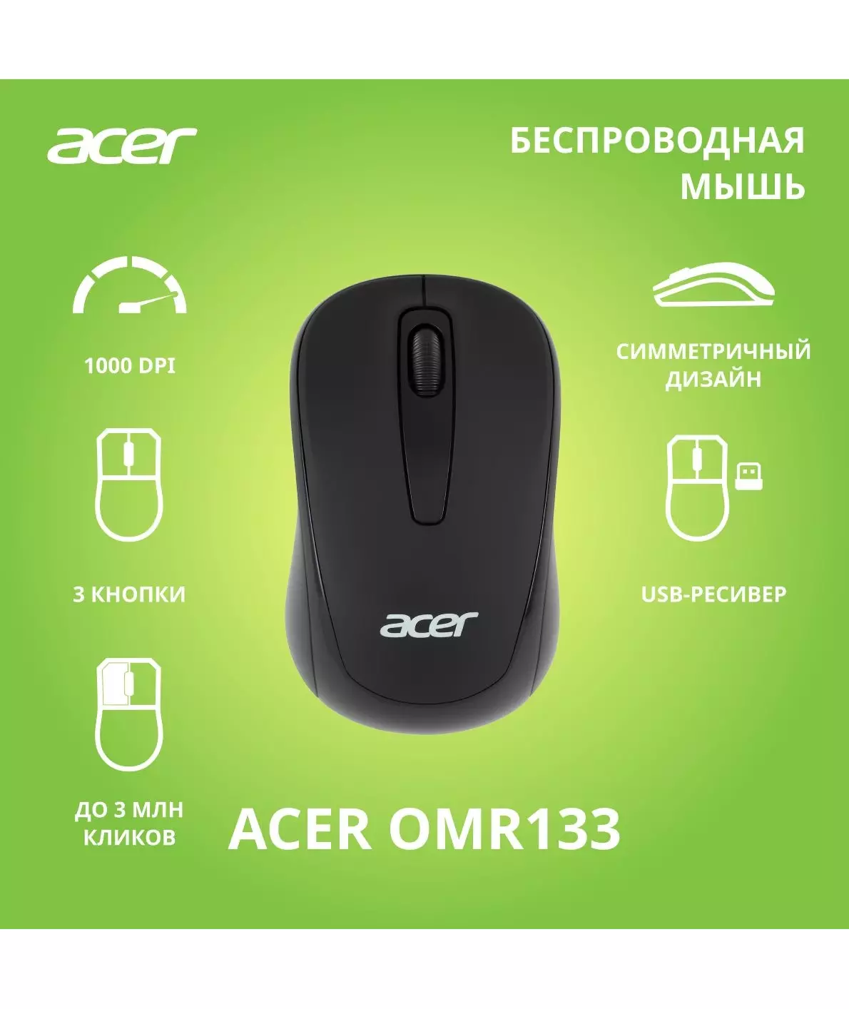 Мышь Acer OMR133 черный оптическая 1000dpi беспров. USB для ноутбука 2but [ZL.MCEEE.01G]