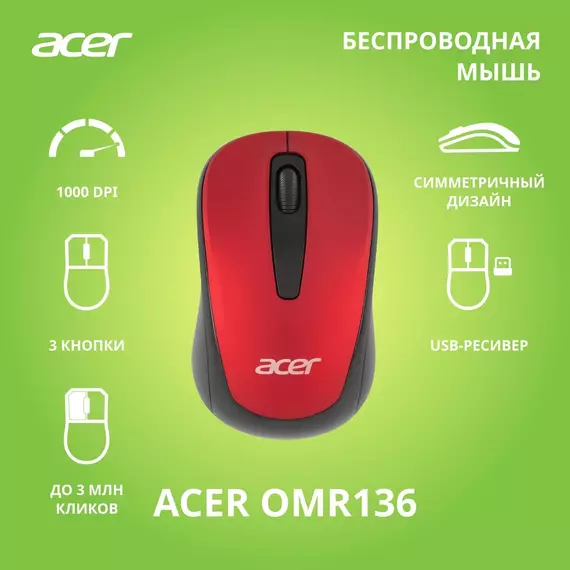 Мышь Acer OMR136 красный оптическая 1000dpi беспров. USB для ноутбука 2but [ZL.MCEEE.01J]