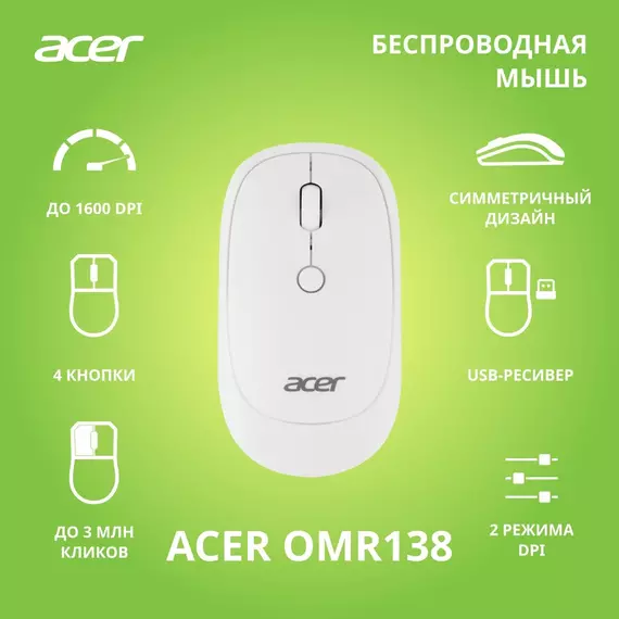 Мышь Acer OMR138 белый оптическая 1600dpi беспров. USB 3but [ZL.MCEEE.01L]