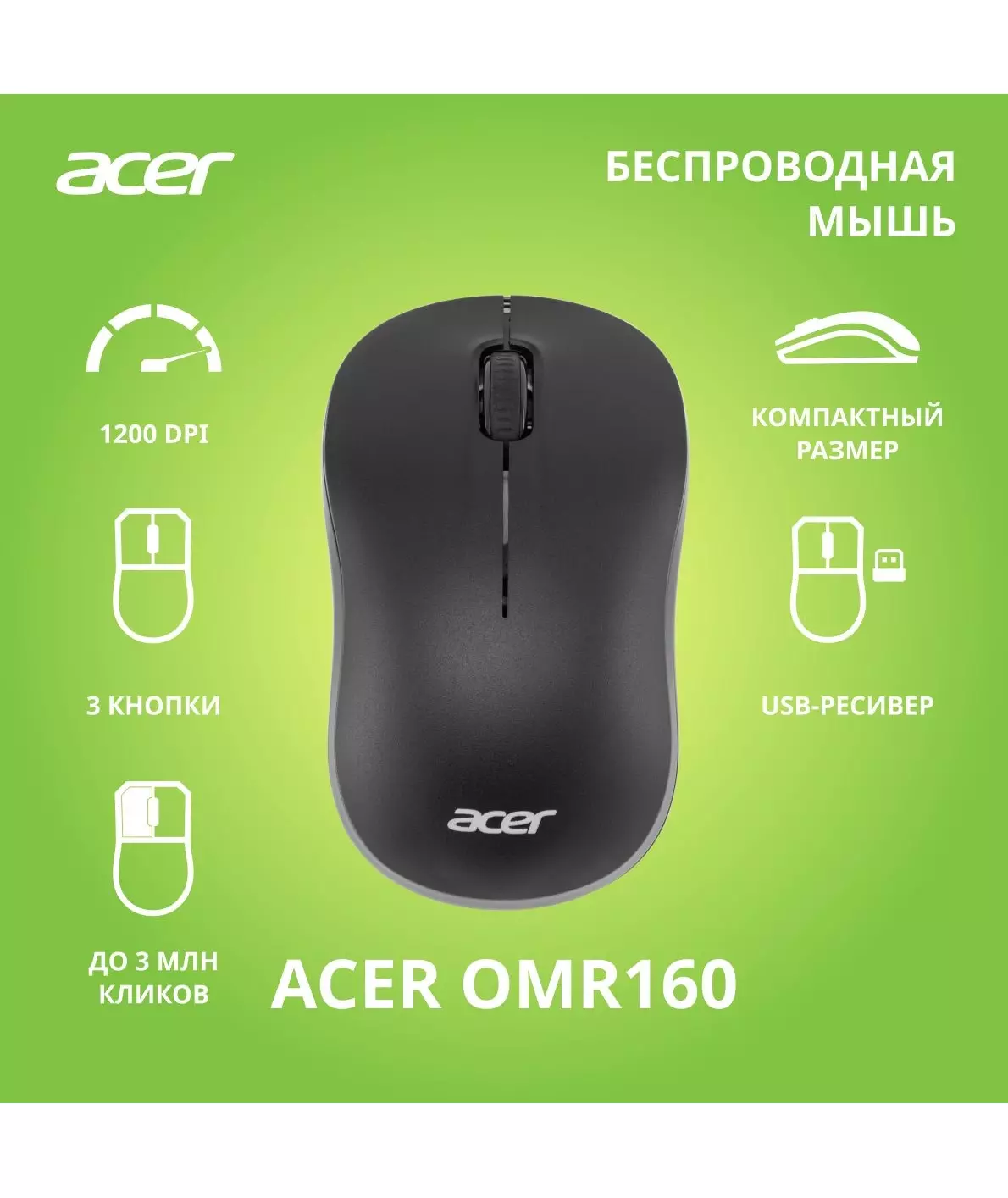 Мышь Acer OMR160 черный оптическая 1200dpi беспров. USB 3but [ZL.MCEEE.00M]