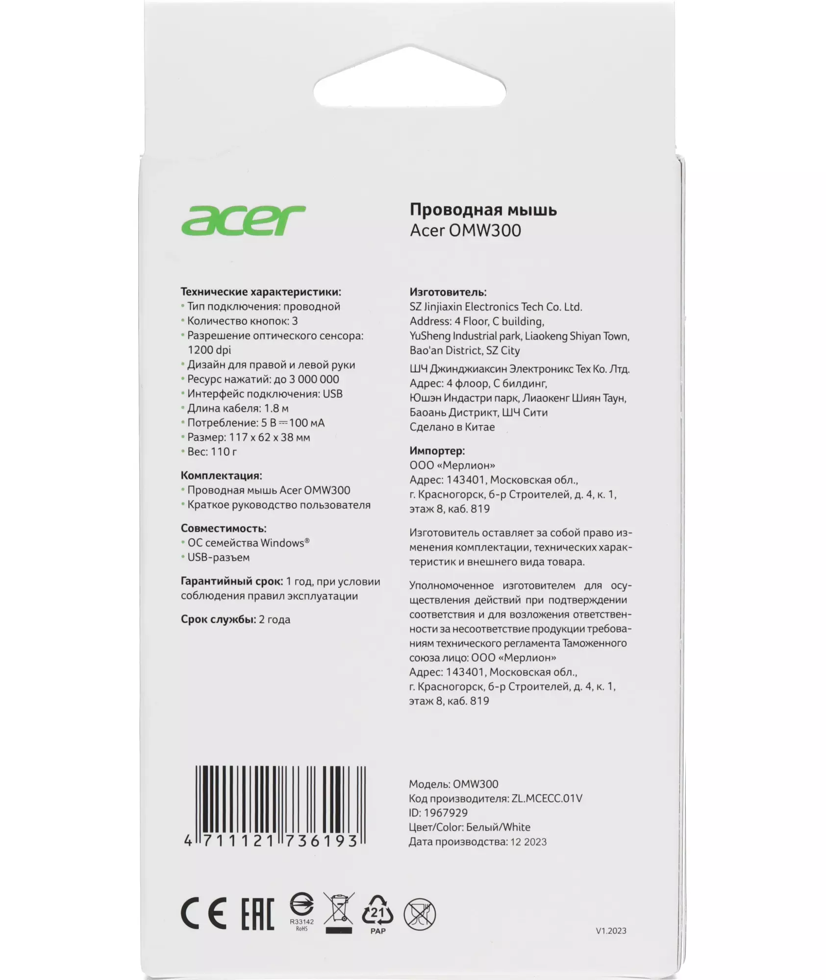 Мышь Acer OMW300 белый оптическая 1200dpi USB 3but [ZL.MCECC.01V]