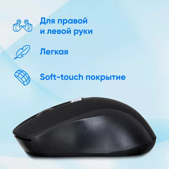 Мышь выполнена в симметричном дизайне – подходит как для правой, так и для левой руки, что делает модель доступной для широкого круга. Благодаря покрытию soft-touch текстура мыши приятна на ощупь и защищена от скольжения.