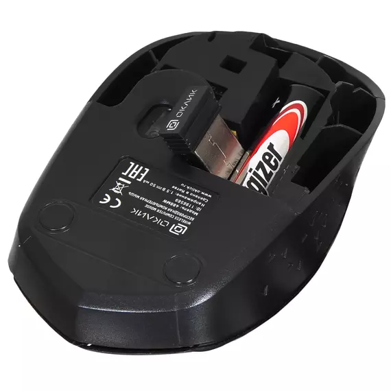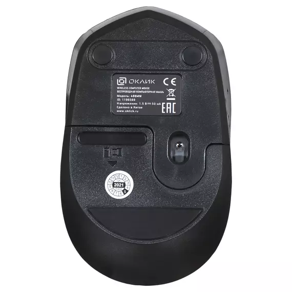 Oklick 488MW подключается к ПК по радиоканалу 2,4 ГГц. В комплект входит USB-ресивер, убирающийся в корпус, а также одна пальчиковая батарейка типа АА.